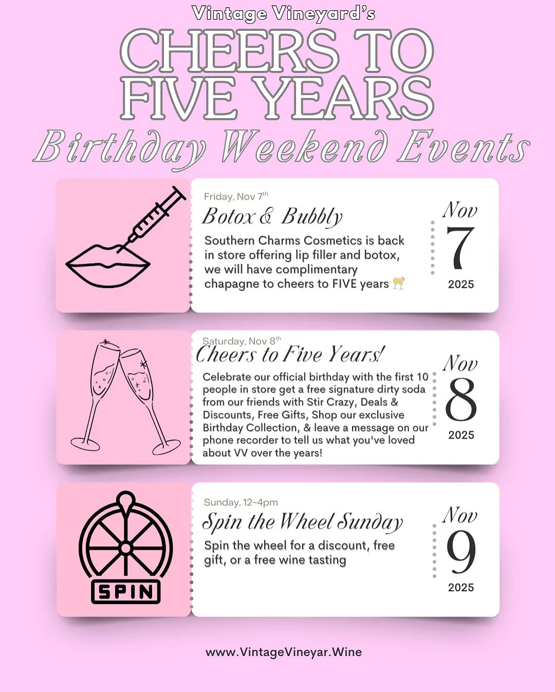 Vintage Vineyard is proud to host several classes and events throughout the year, allowing quality experiences and memories to take place in our small town. We are a fun place for the girls to be girls and we will always support shopping, a good time, and day drinking.