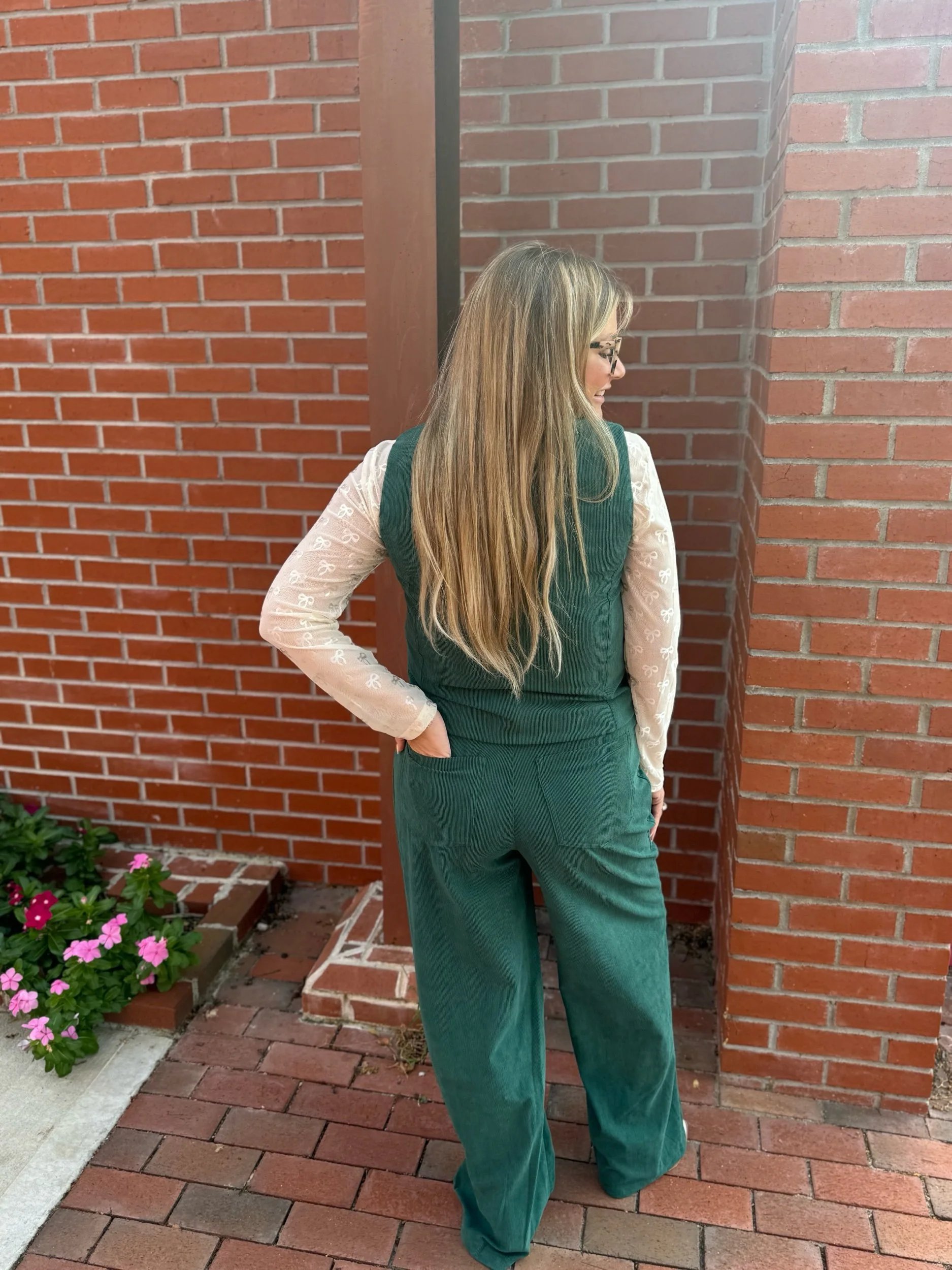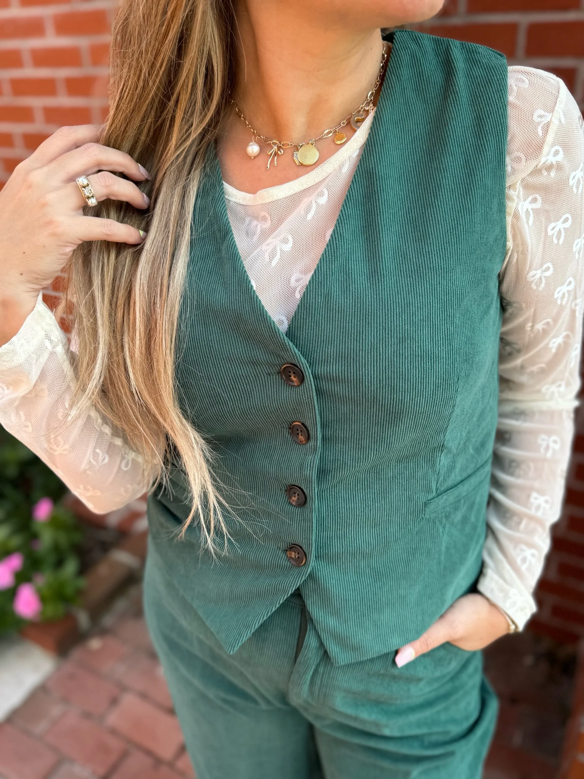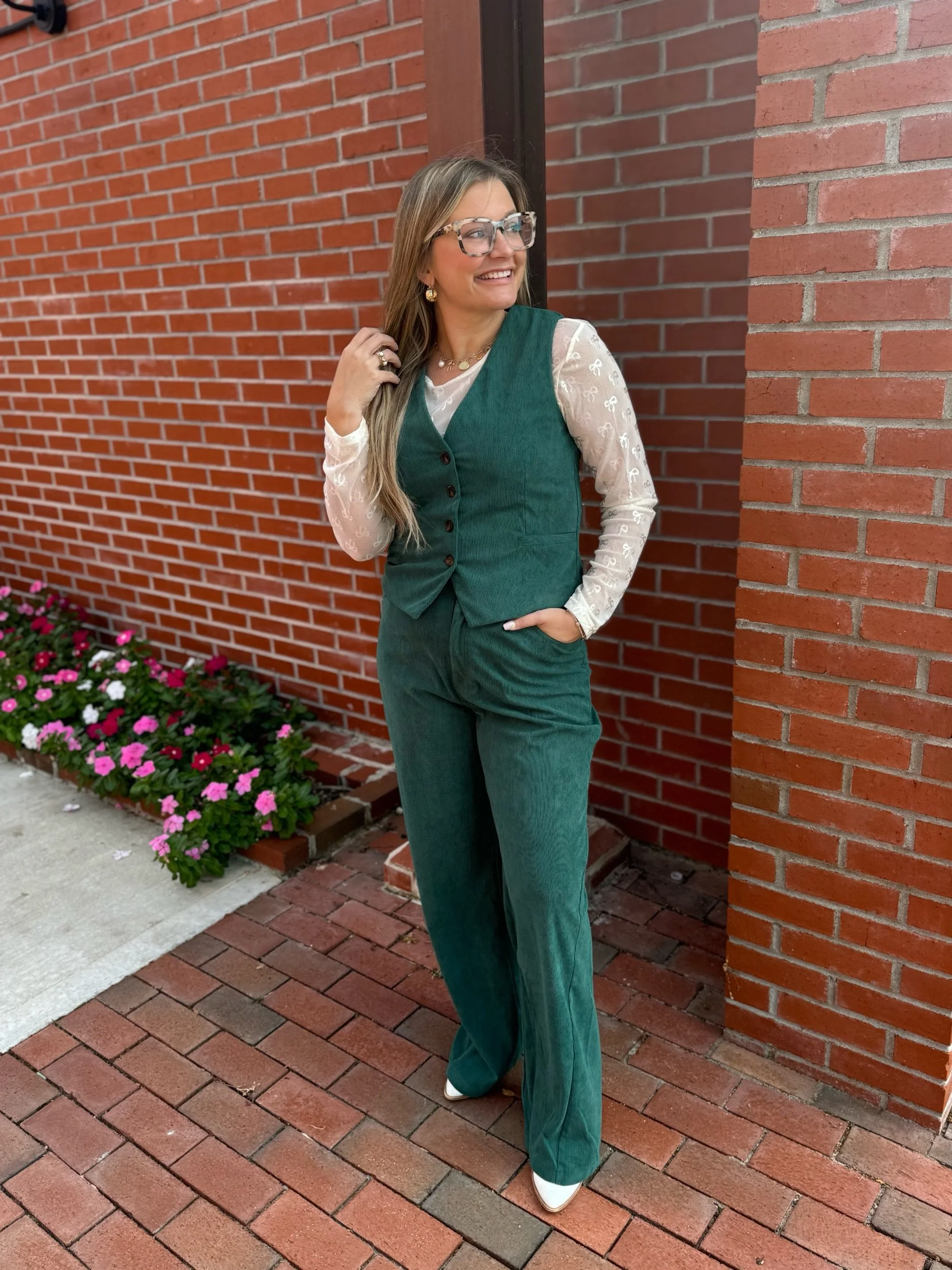 Feel Festive and put together with this two piece corduroy vest set. High waisted pants, functional buttons and pockets.