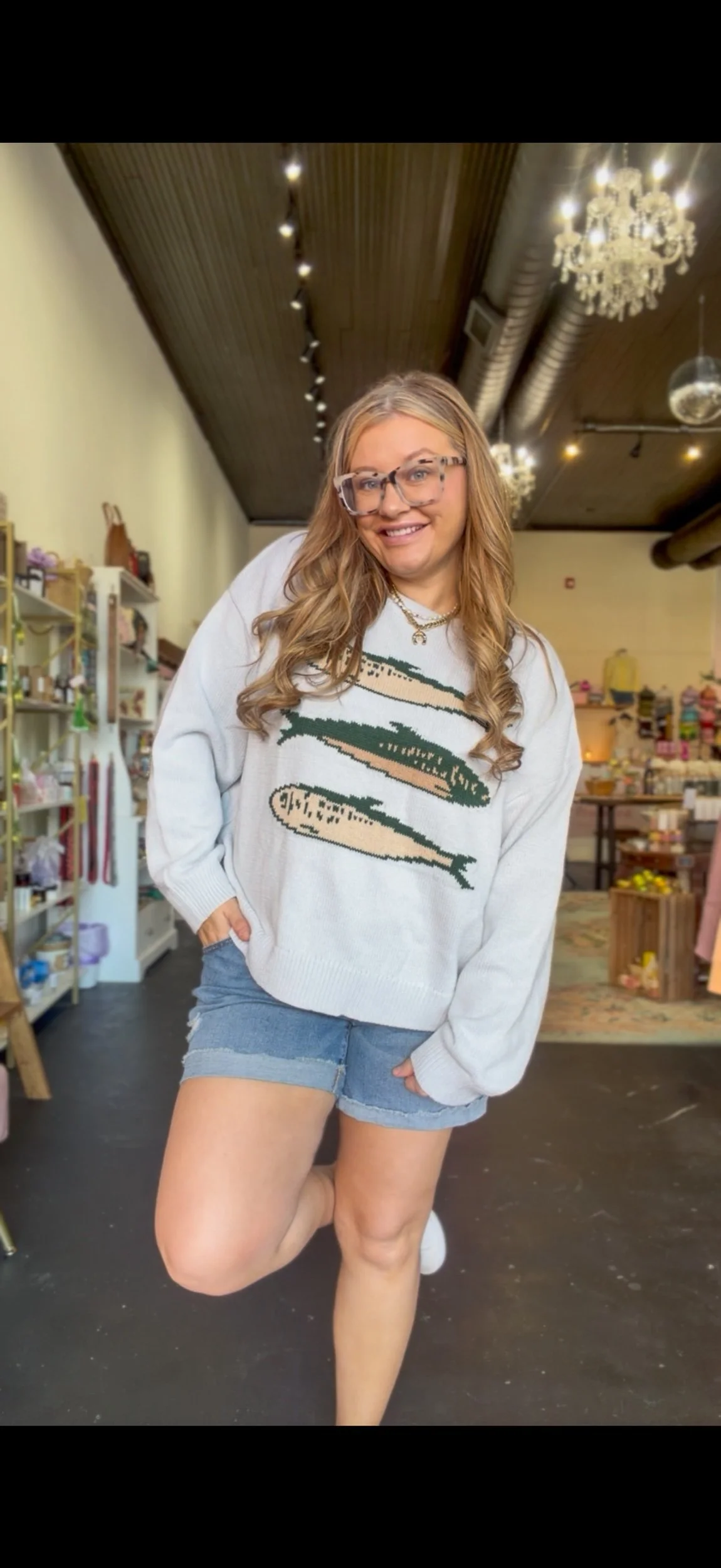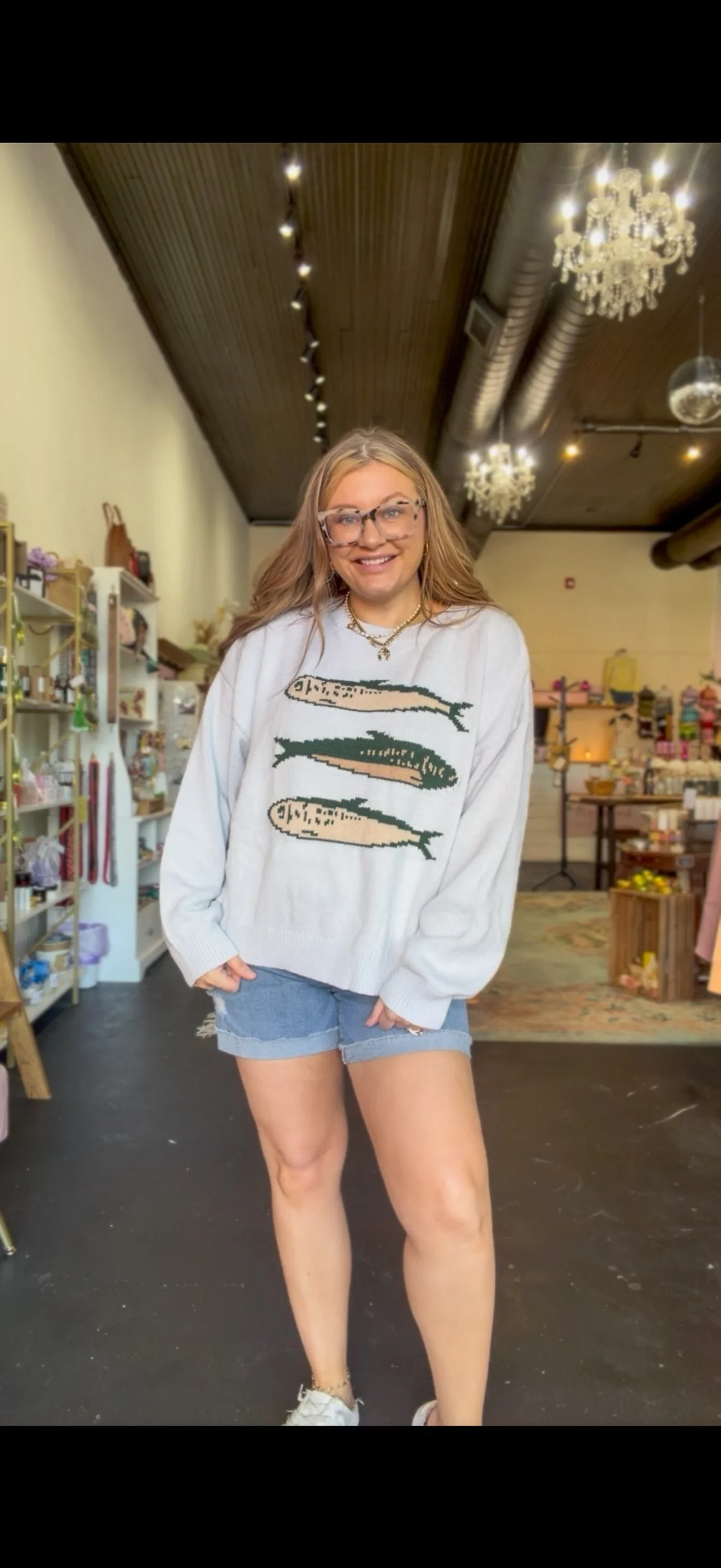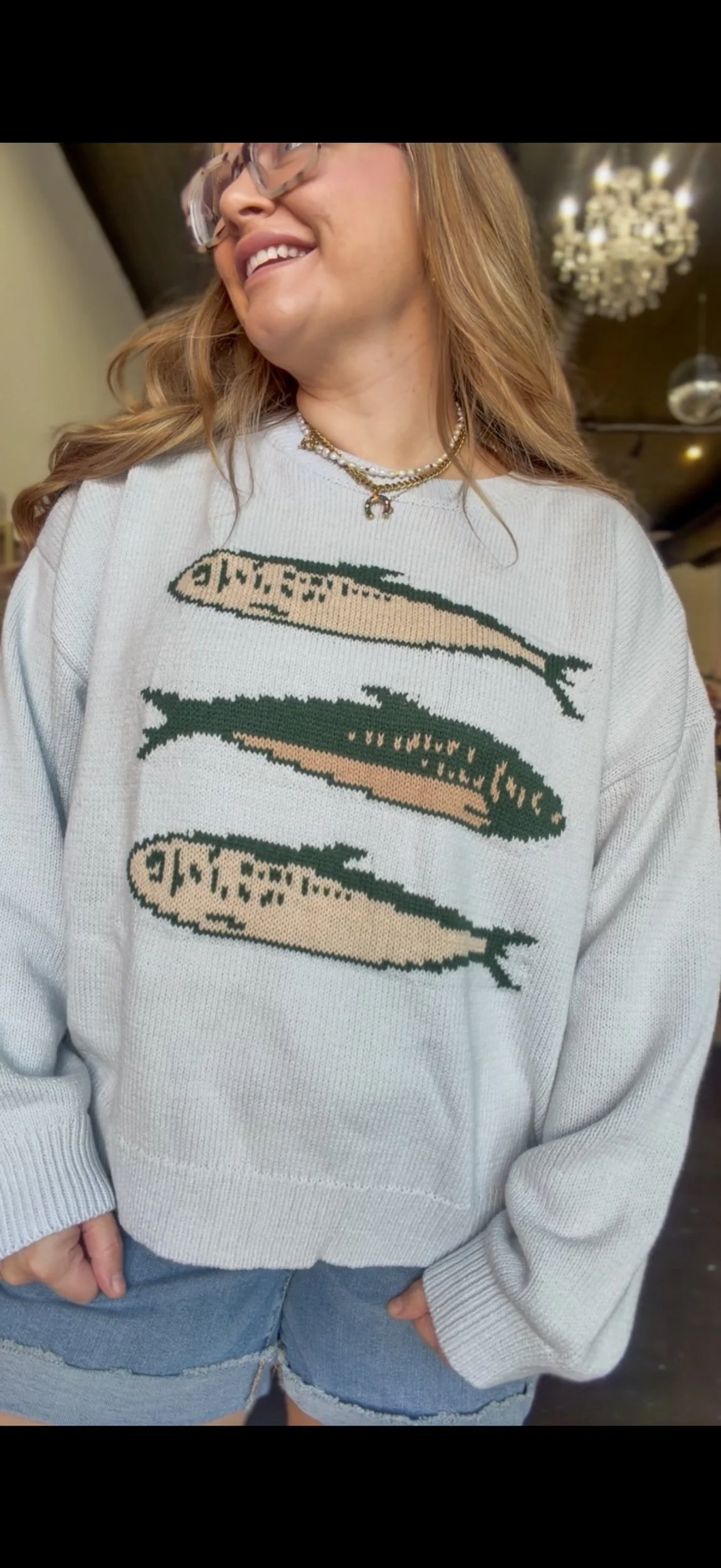 Shop › Sandy Sardine Sweater Image 1 of 4 Image 2 of 4 Image 3 of 4 Image 4 of 4 Sandy Sardine Sweater $46.99 Loose fitting knitted sweater with sardine detail. Brittany is wearing a size medium. size: Small Medium Large XSmall Add To Cart Added! Loose fitting knitted sweater with sardine detail. Brittany is wearing a size medium. Reviews Reviewer Name Review Date Star Rating Description Posted on Etsy Product Show More You Might Also Like Quick View Joan Sweater Brown $35.99 Sold Out Quick View Duck Commander Sequence Sweatshirt $45.99 Quick View Lilly Top $19.99 Quick View Sadie Pink Top $29.99 Quick View Daffodil Cropped Tank $24.99