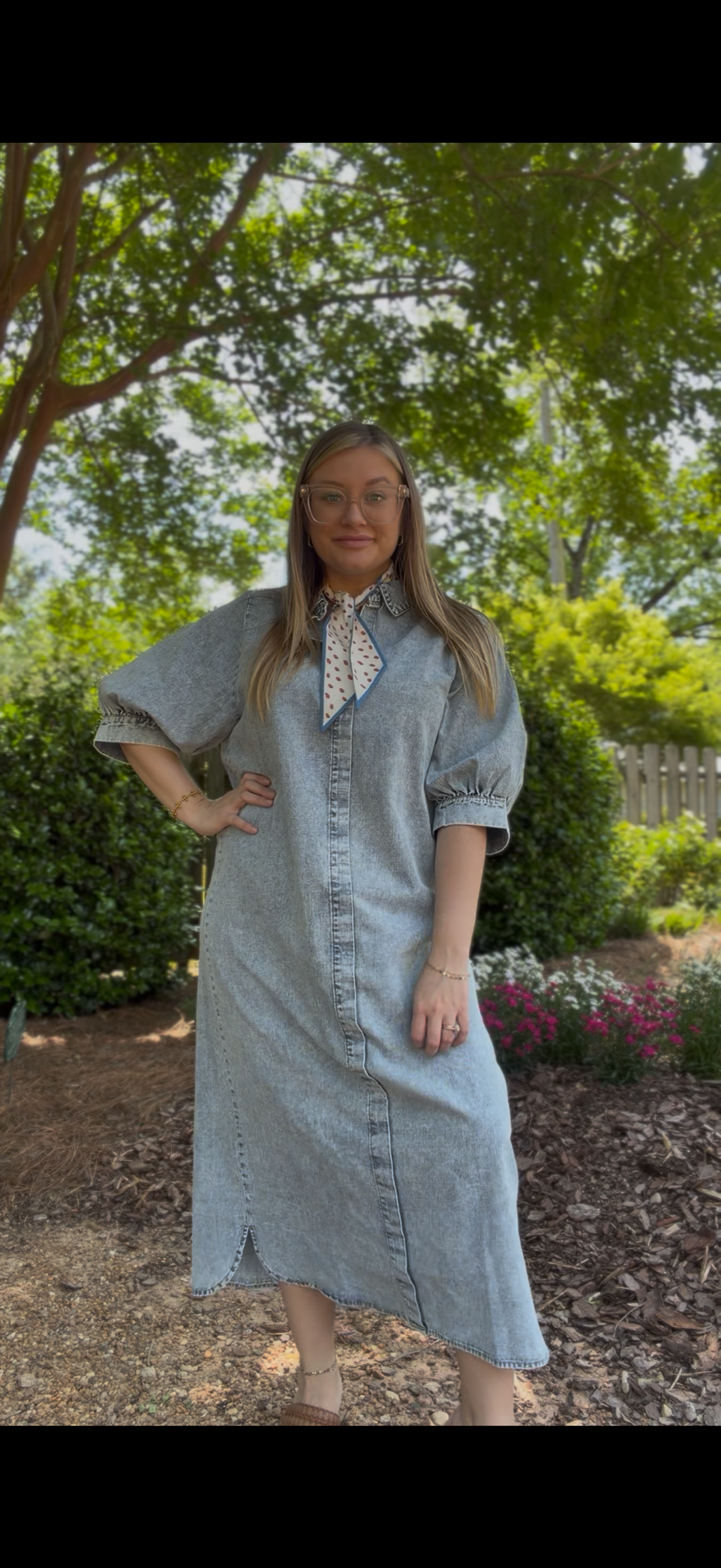 Light weight denim midi dress with v cut collared neckline, and bubble quarter length sleeves. Overall Loose fit