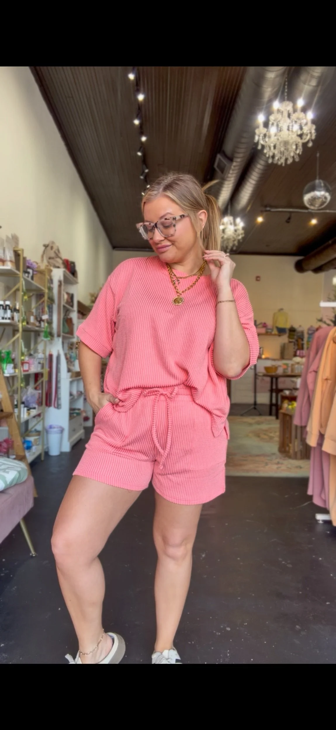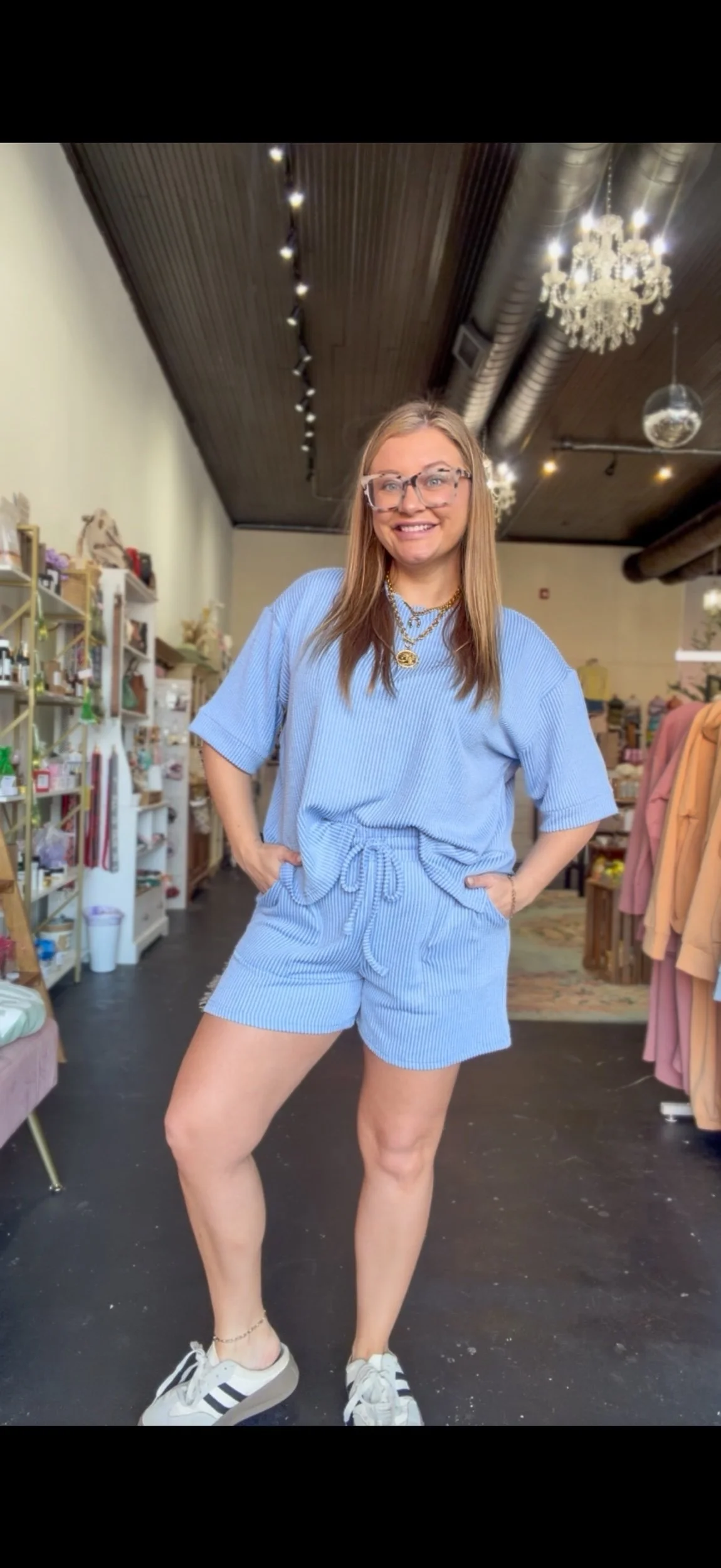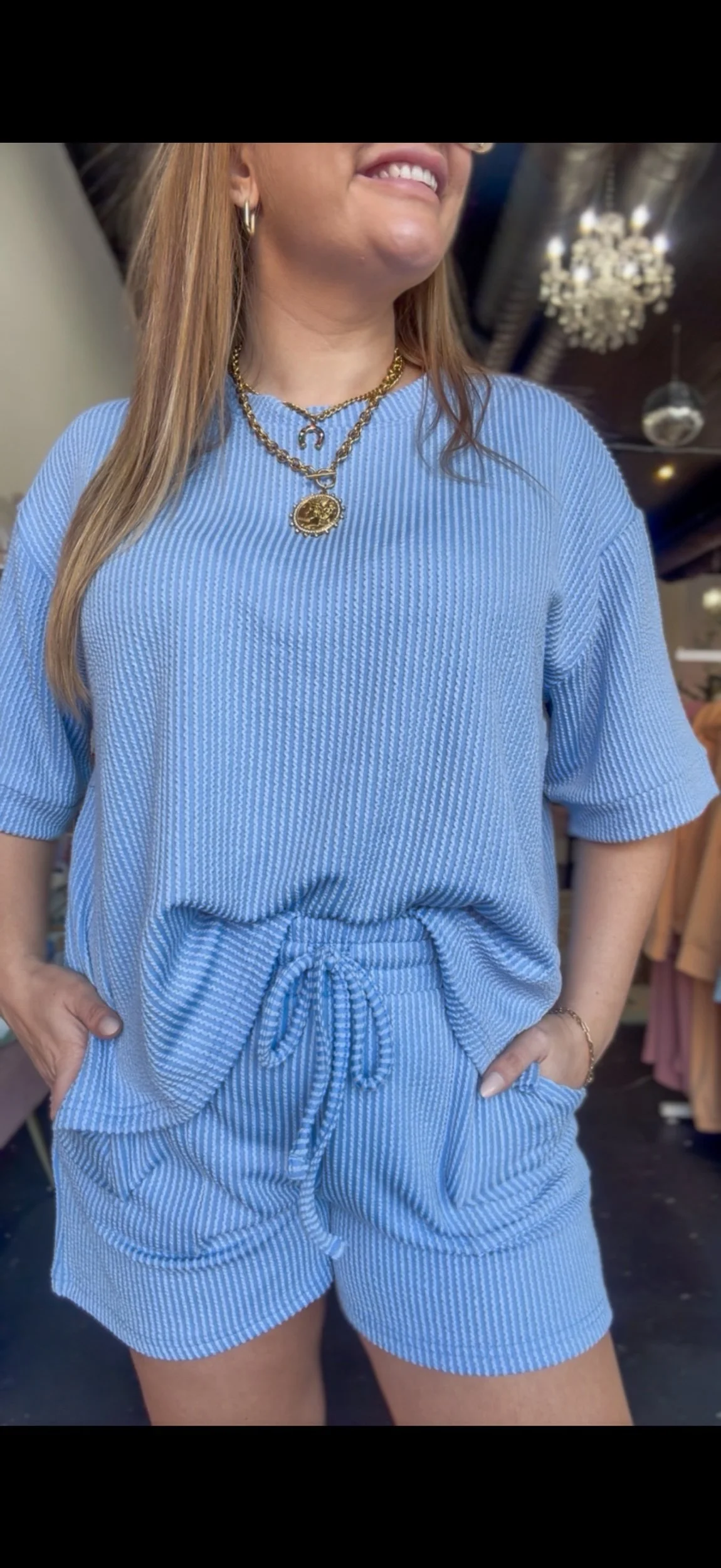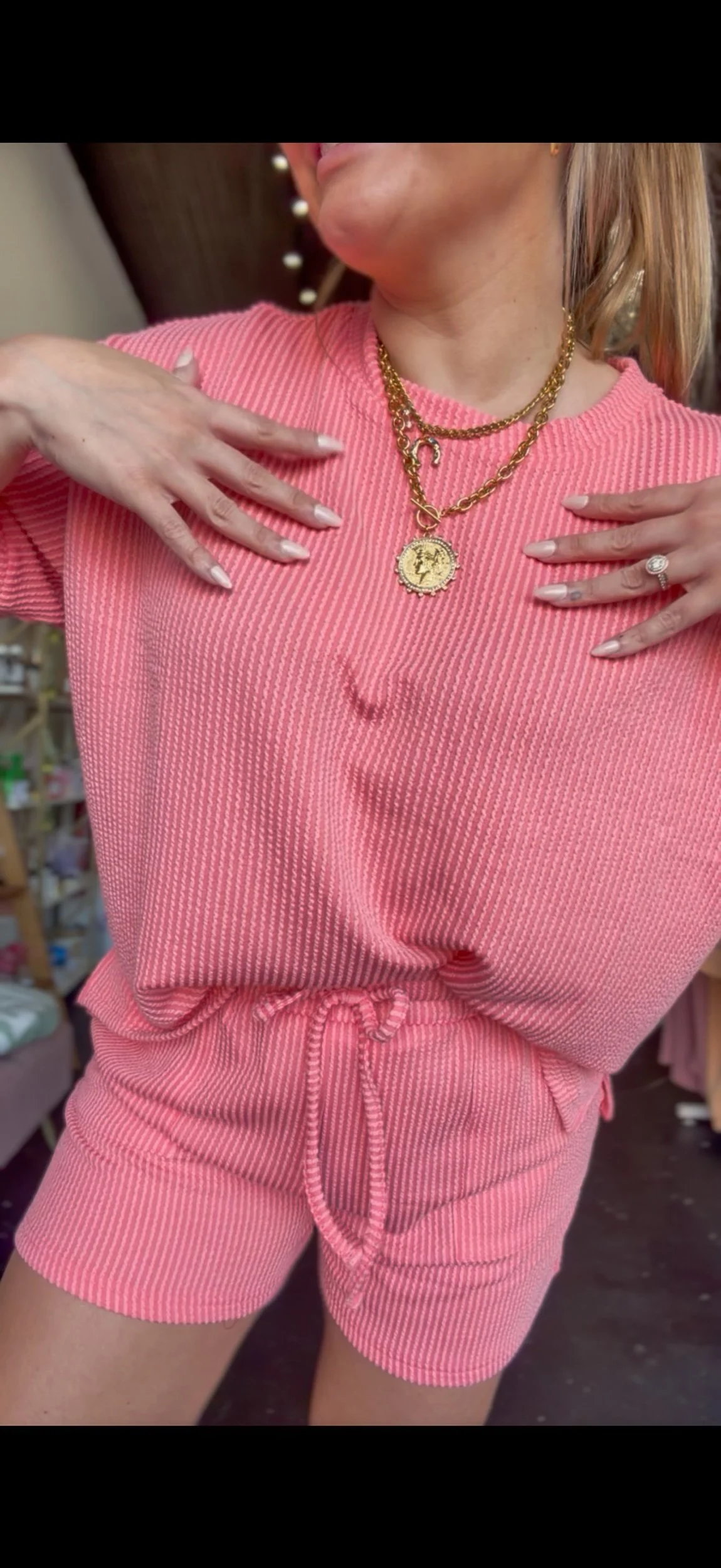 Ribbed textured loose fitting top with matching shorts. The shorts have an elastic waistband, functional draw strings, and pockets.