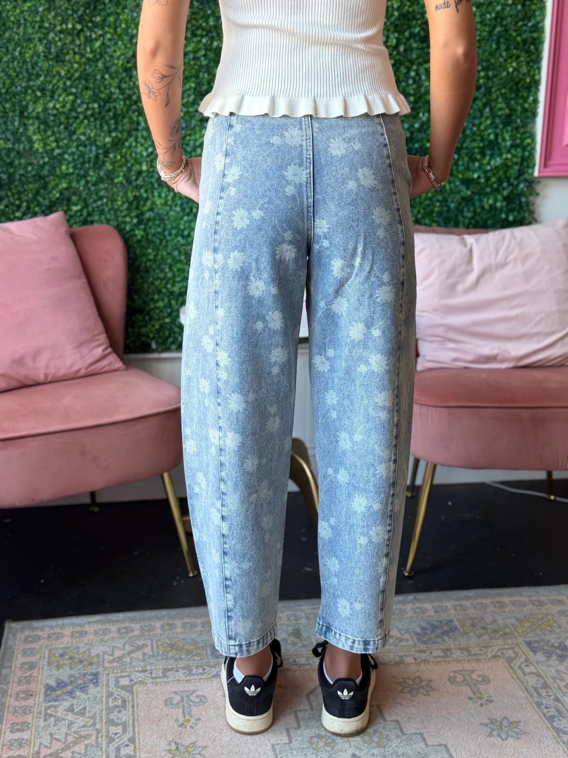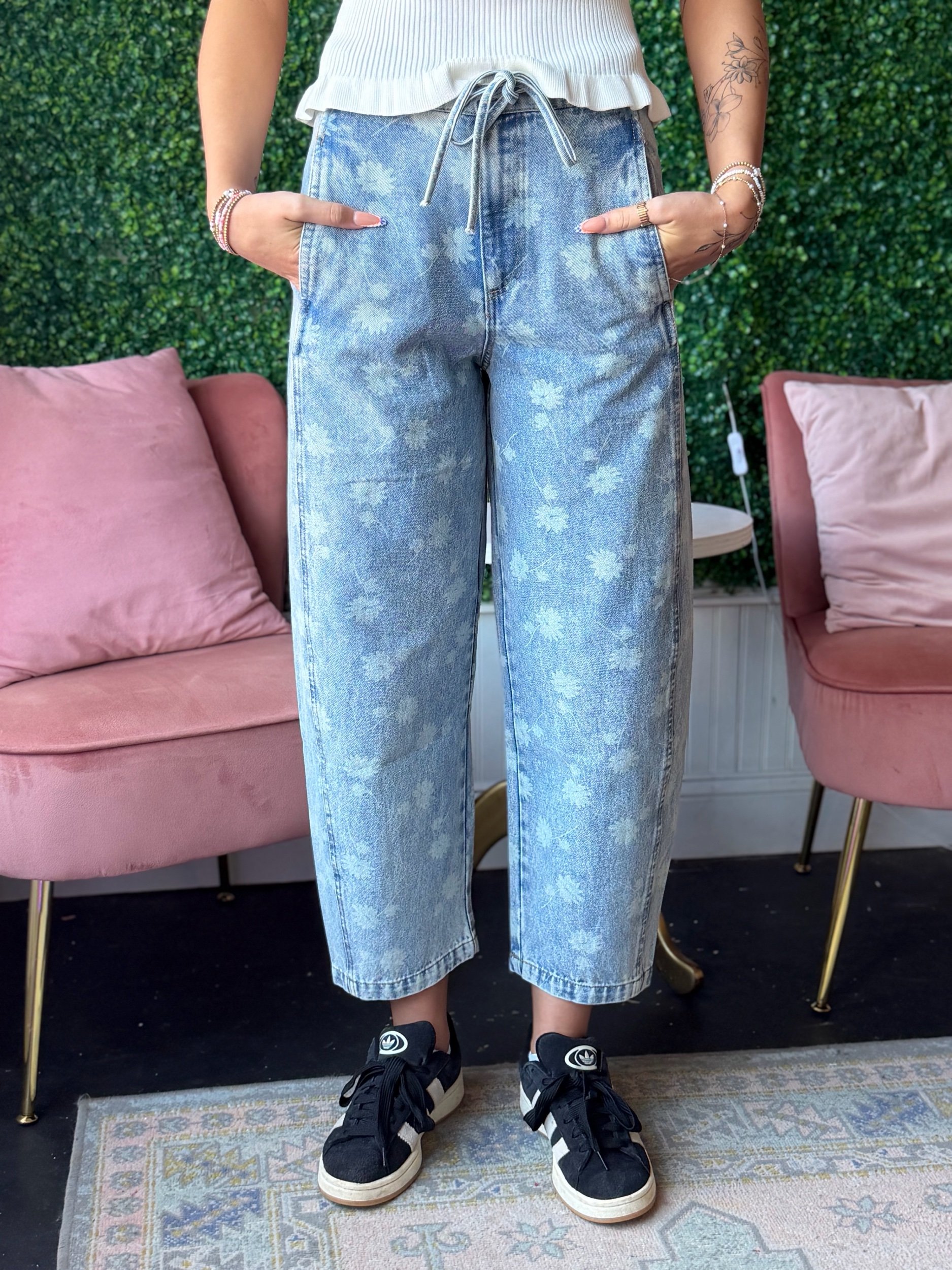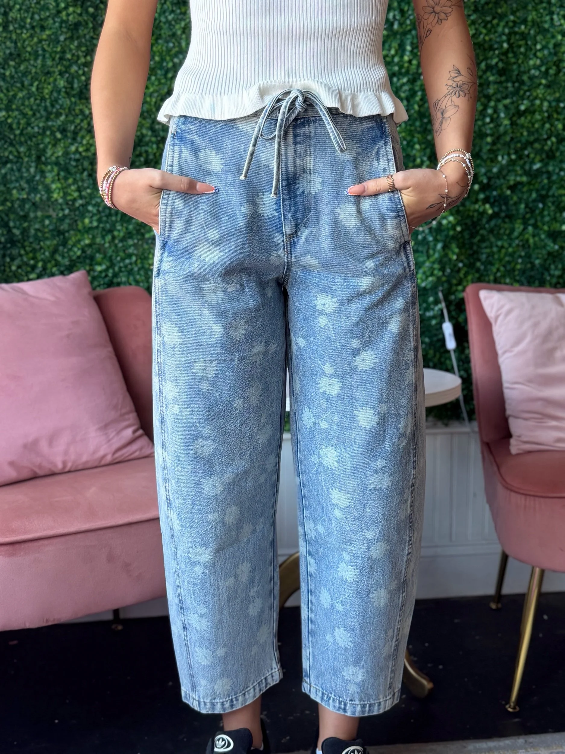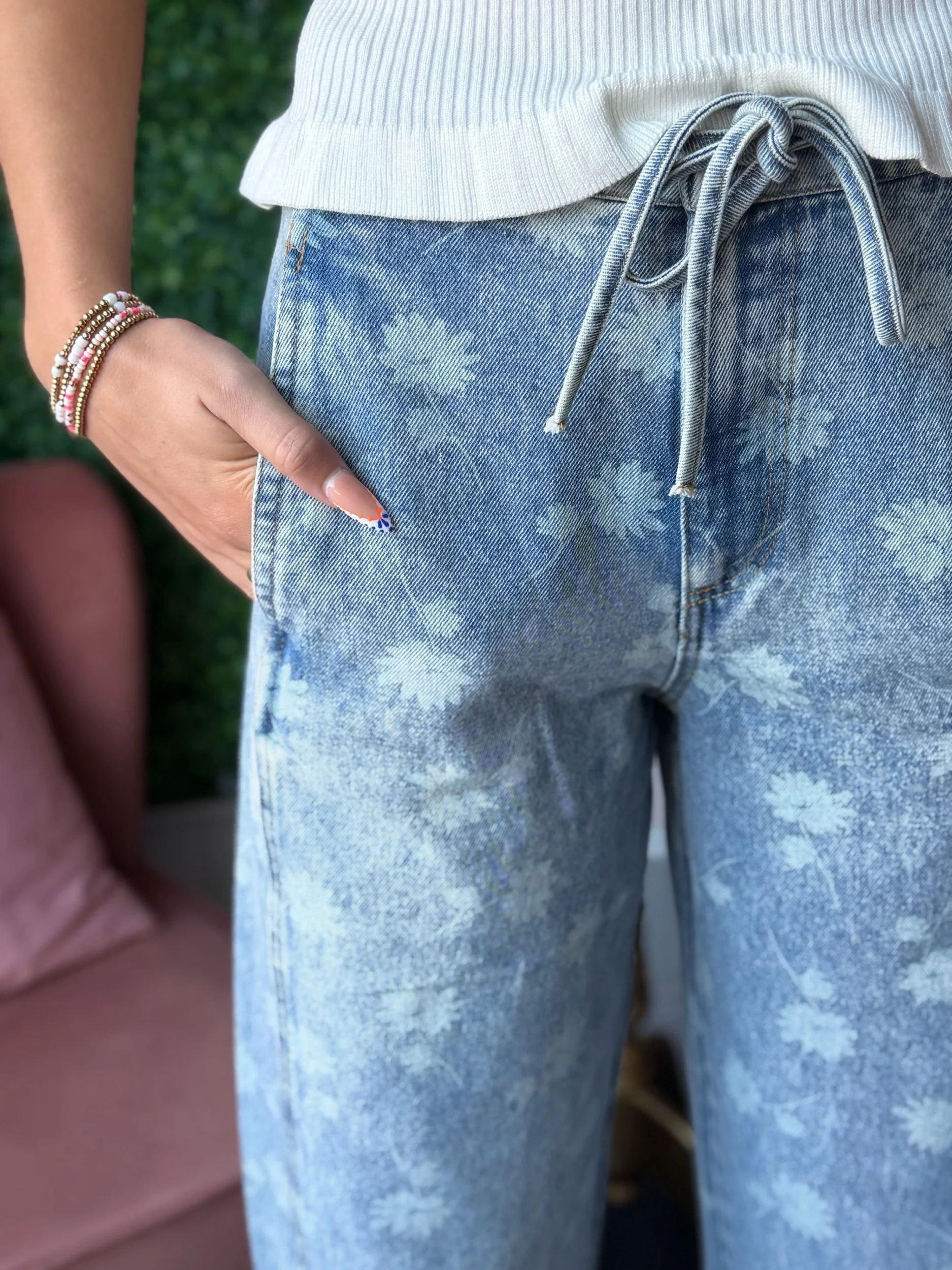 Barrel Jeans with acid wash dandelion print, string belt, front pockets, cropped. Runs small, no stretch.