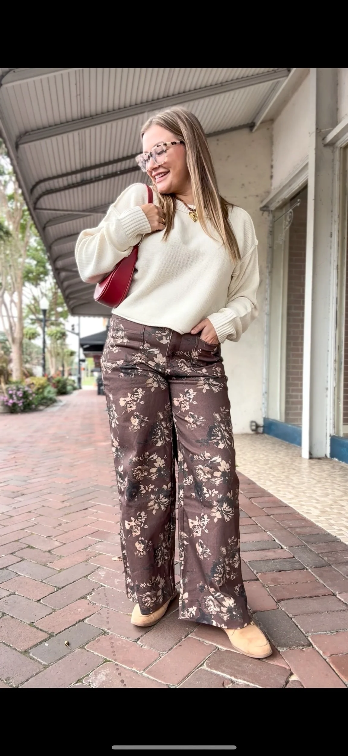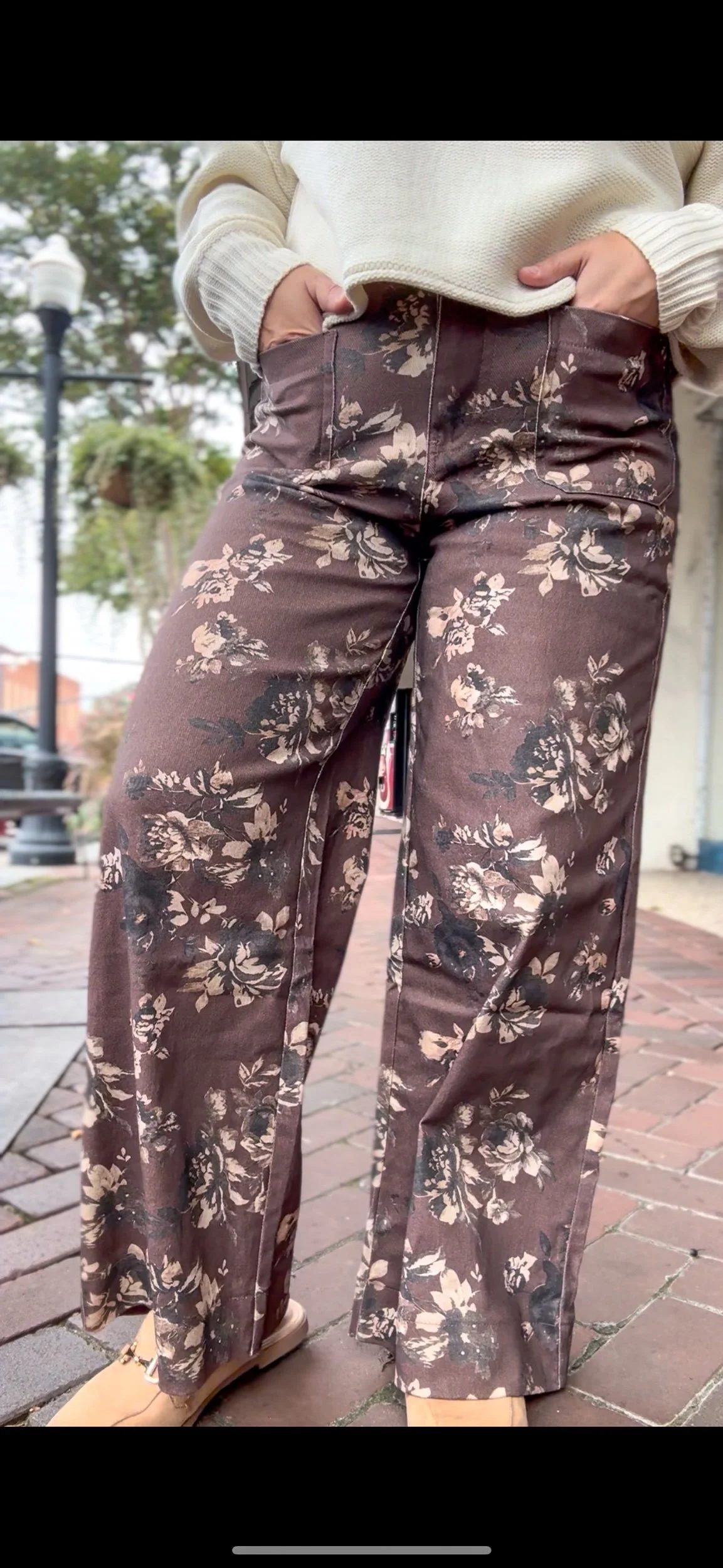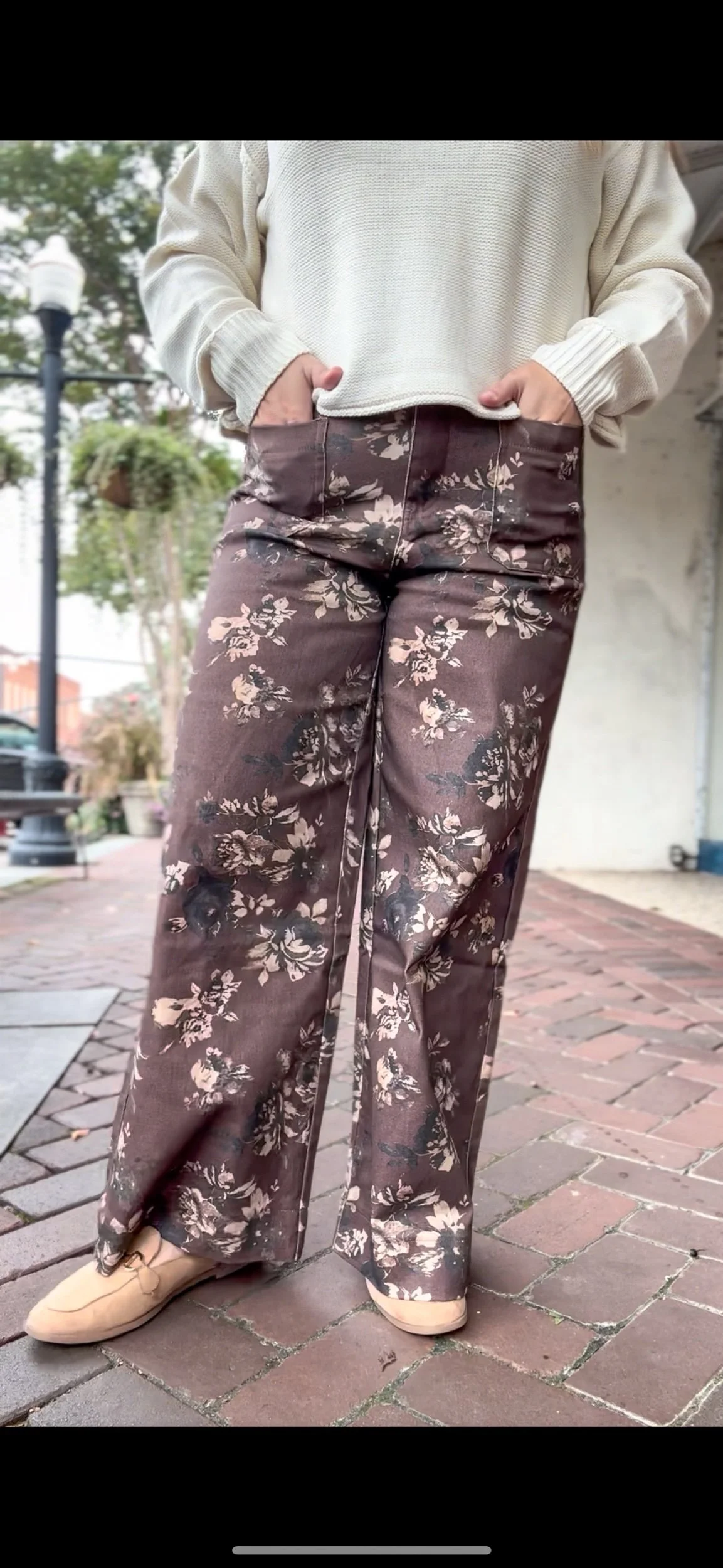 Brown High Waisted floral printed denim with functional pockets, belt loops, and wide leg detail.