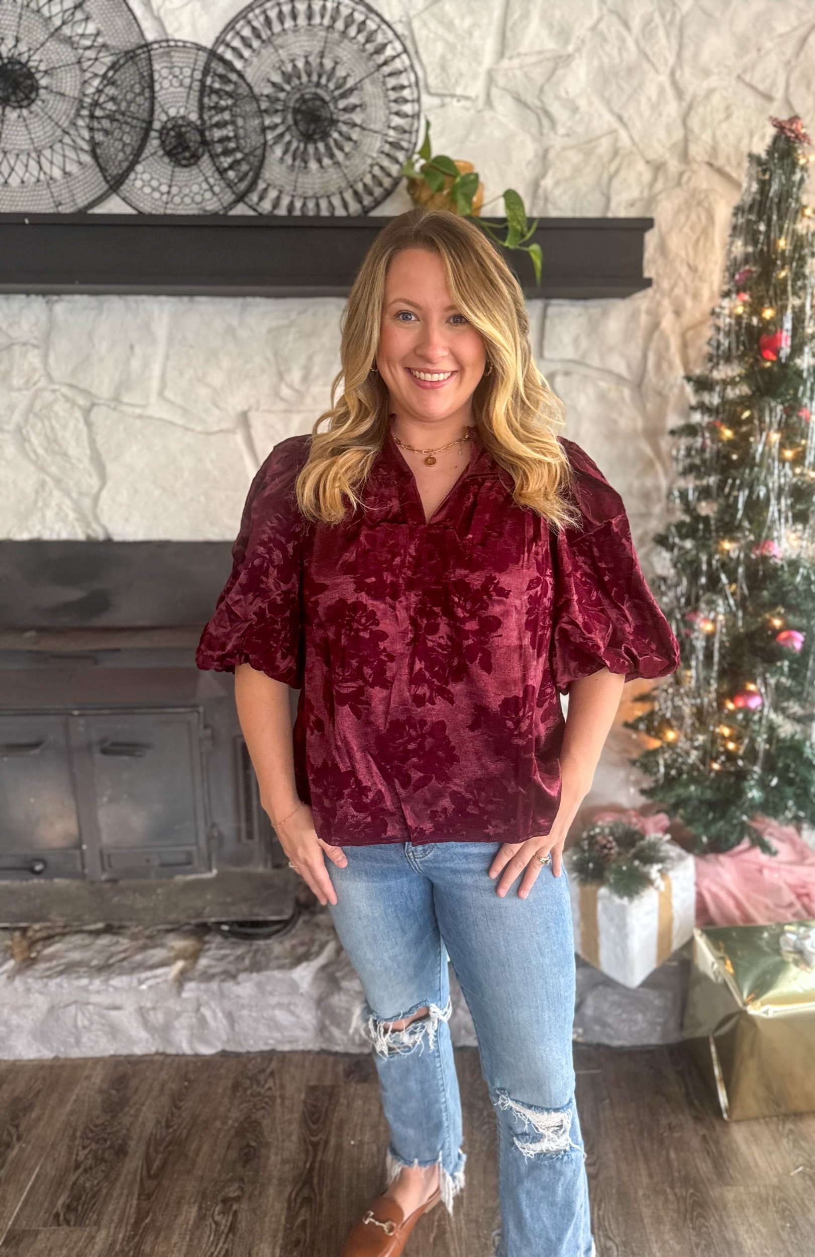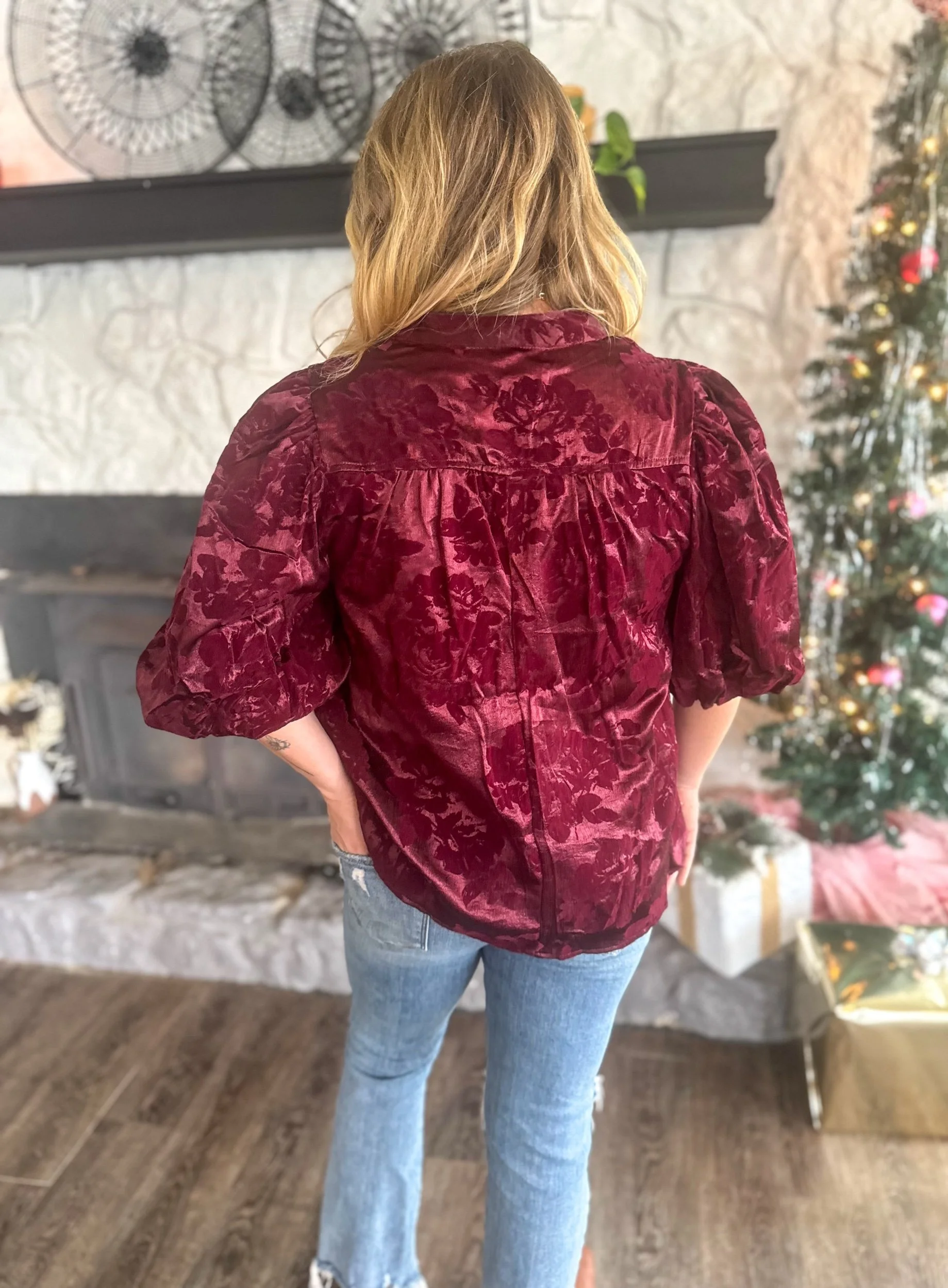 High Round Neck Puff sleeve top with crushed velvet monochromatic detail.