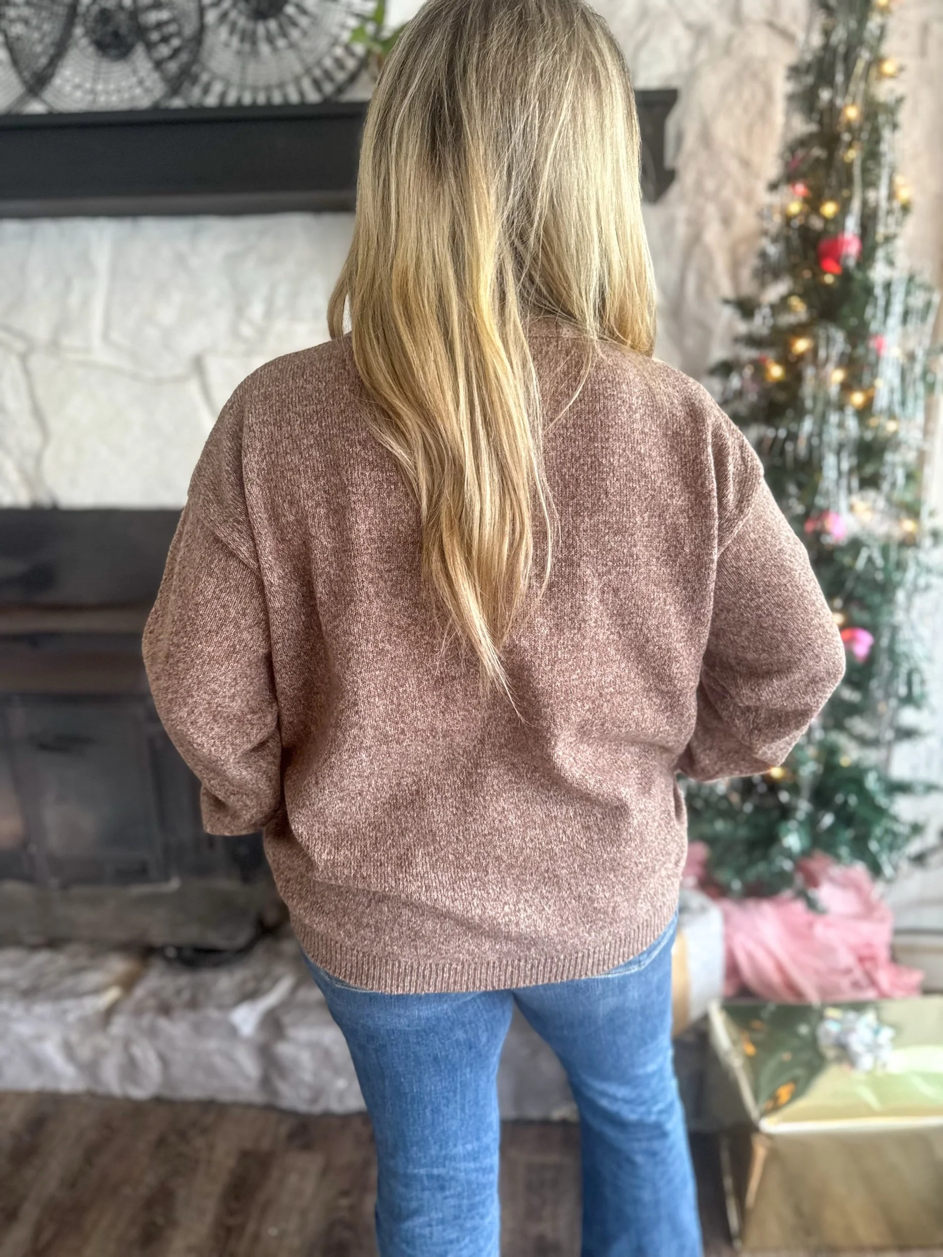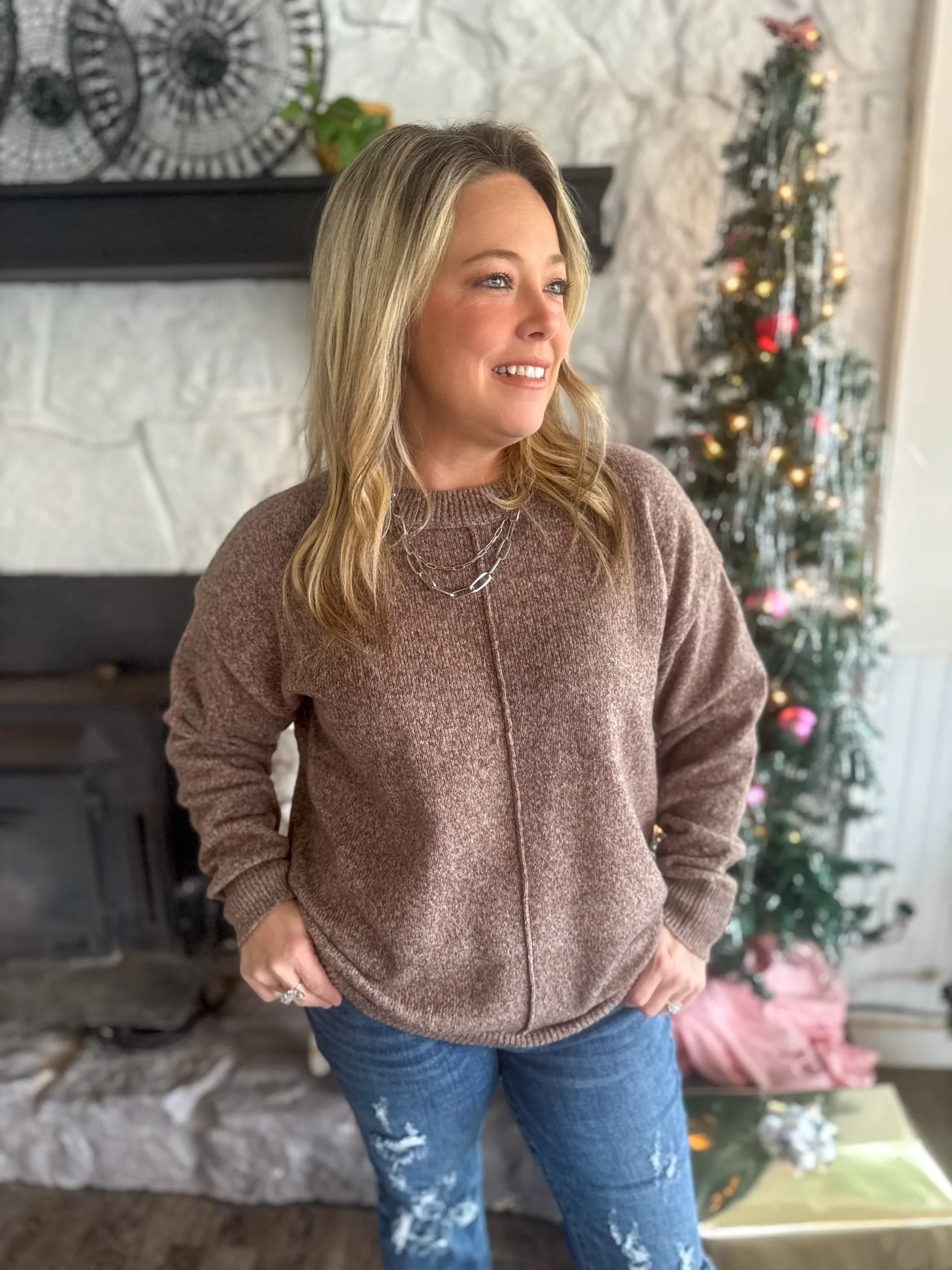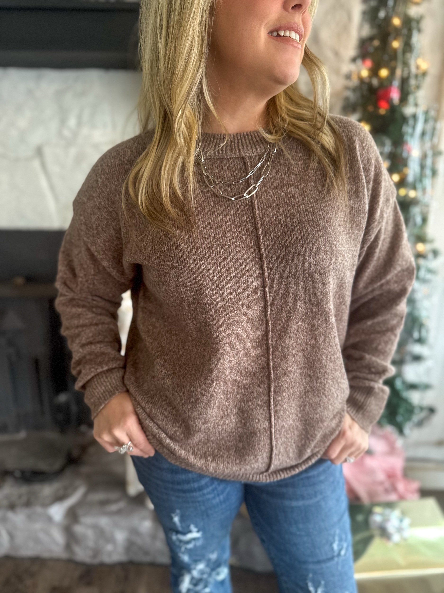 Ultra soft and stretchy sweater with crew neck, neck line and midline center detail.