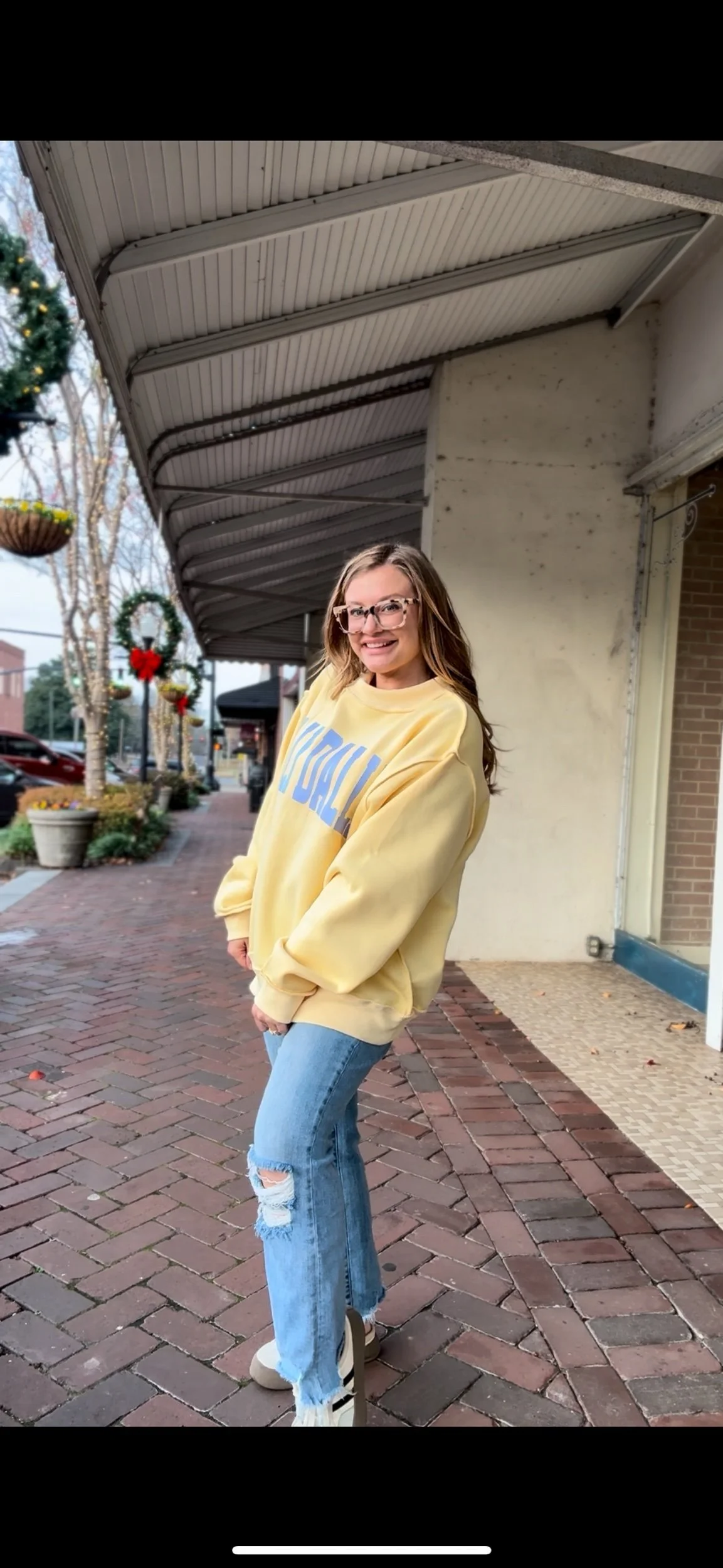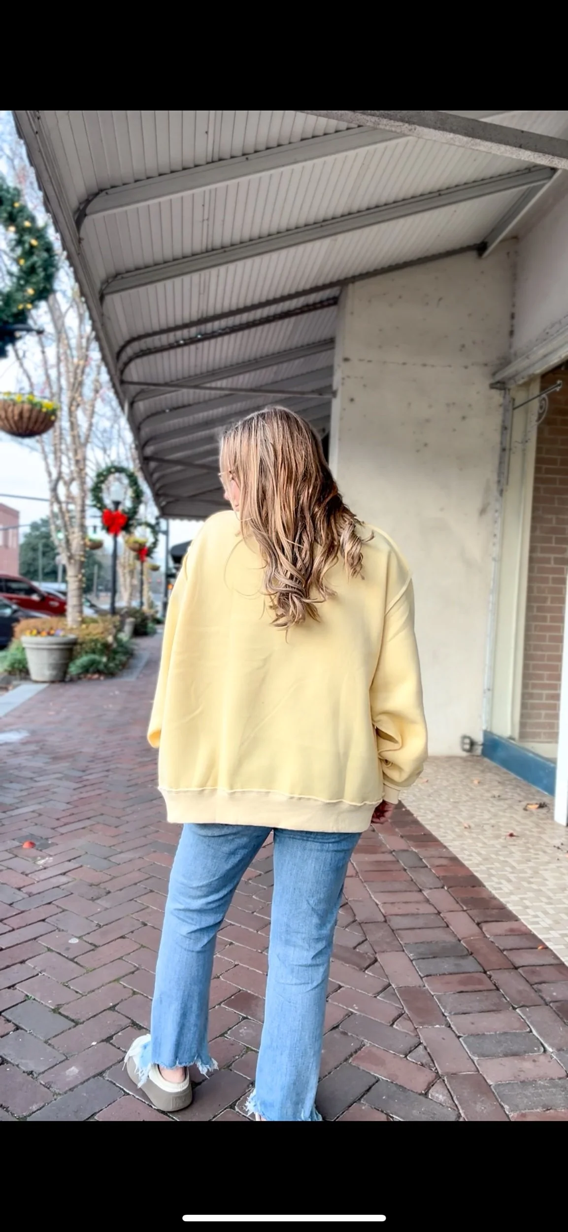 Oversized roomie fit mock neck sweatshirt with raw hem detail, lightly fleece lined, drop shoulder. Butter yellow with powder blue lettering.