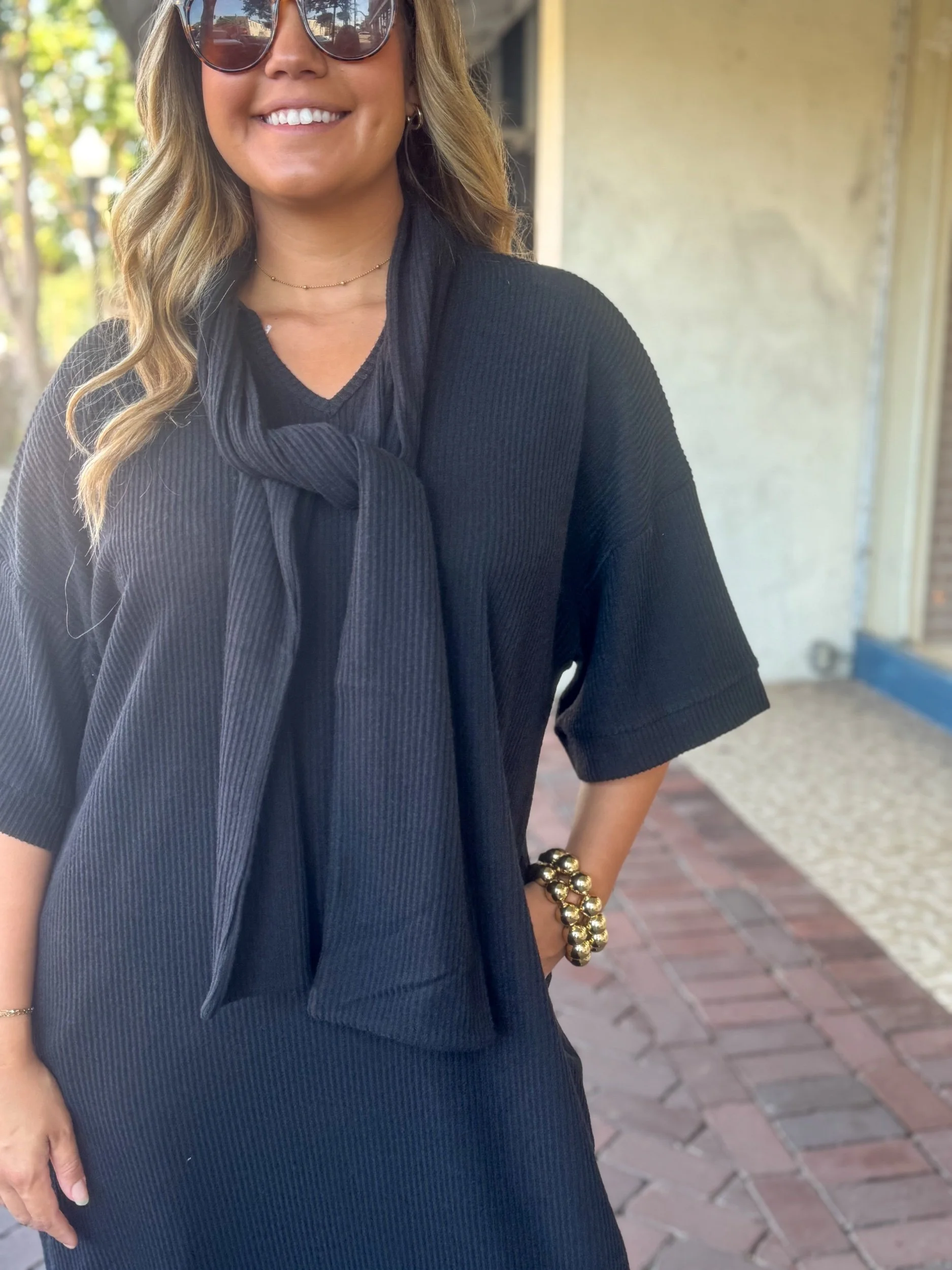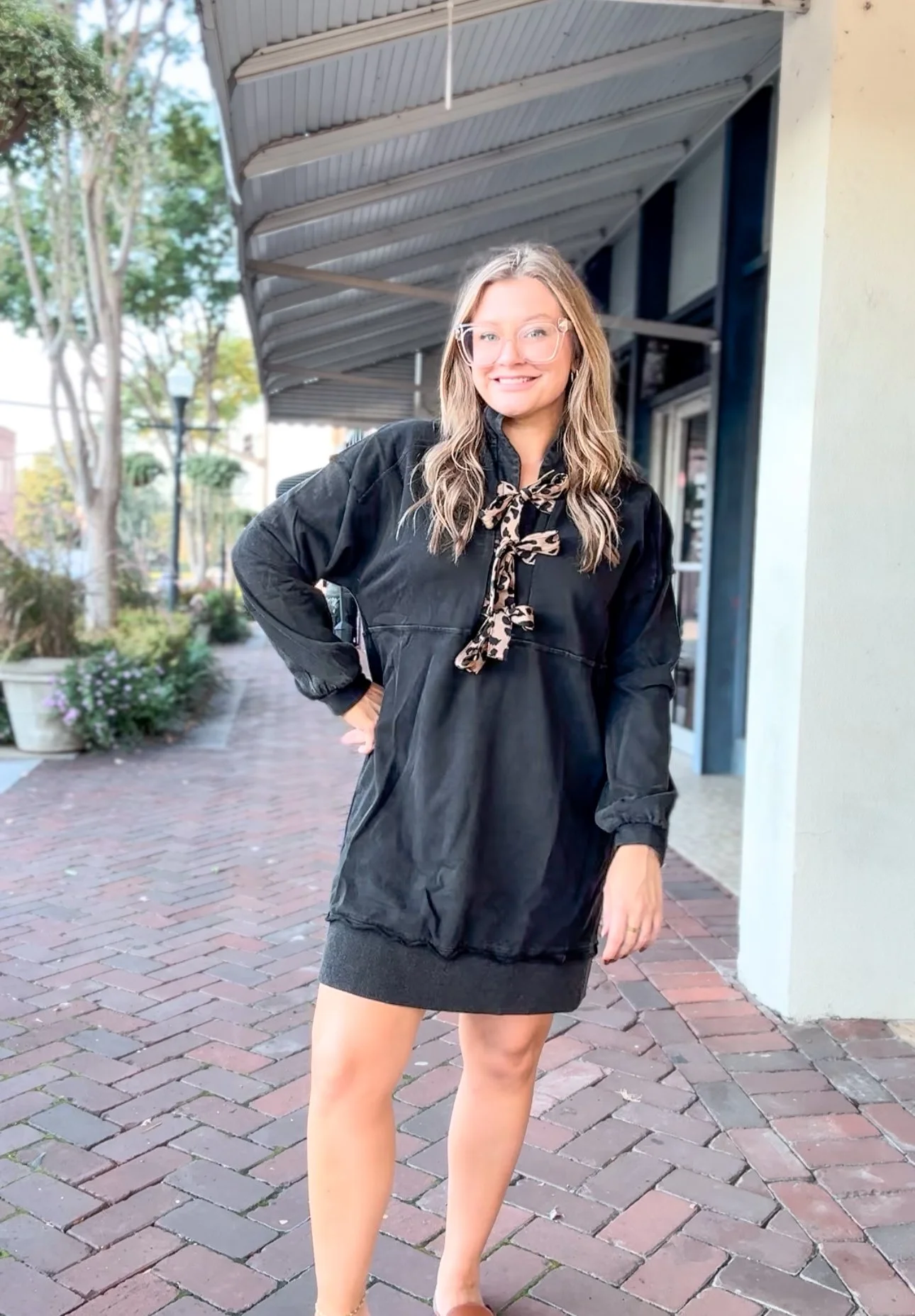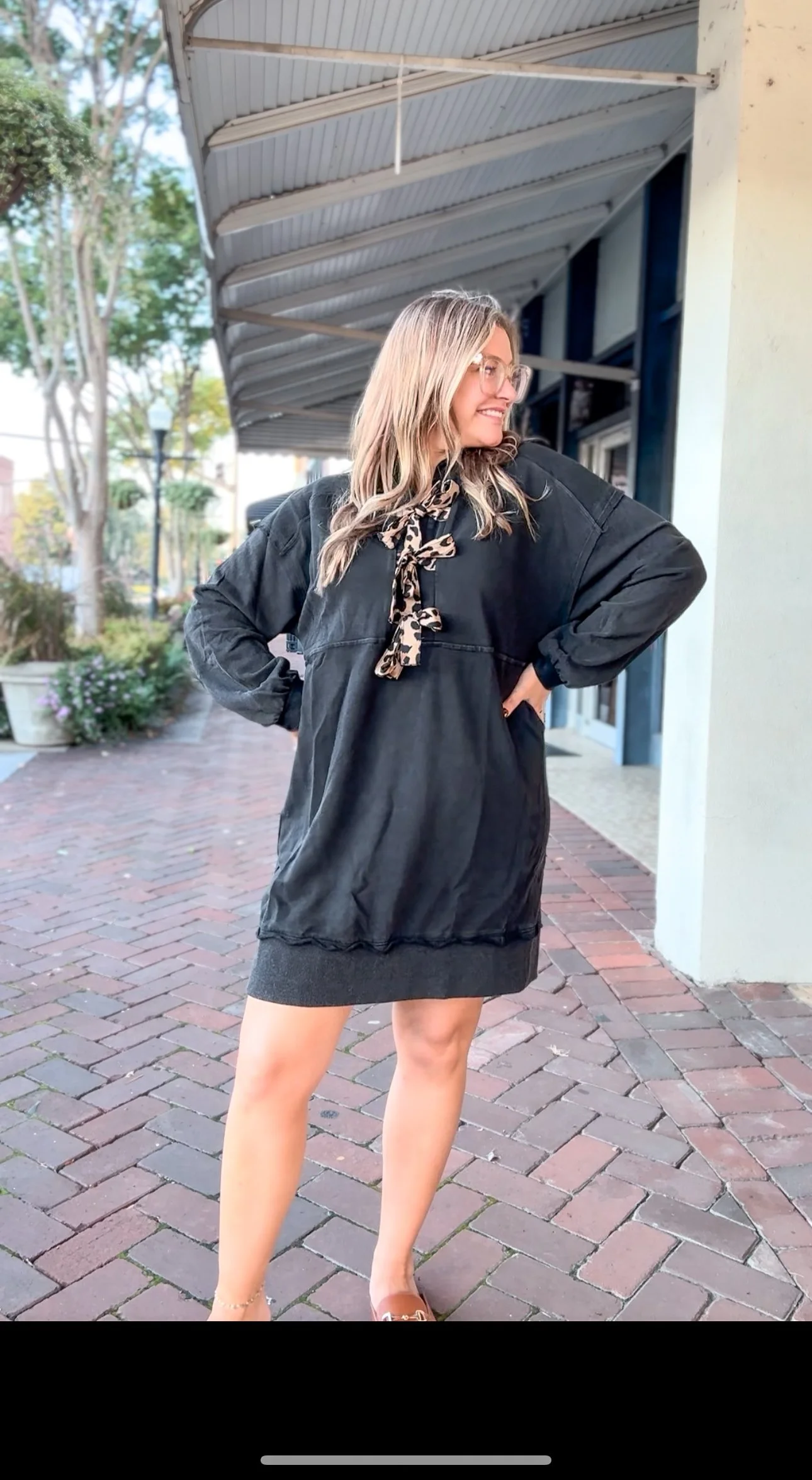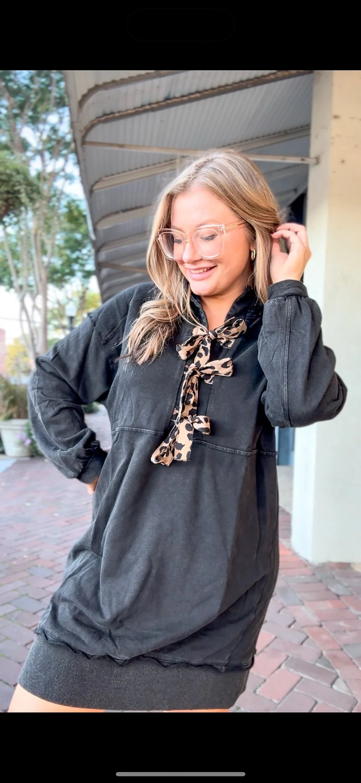 Light weight sweatshirt dress with leopard front tie detail and drop shoulder. Relaxed fit.