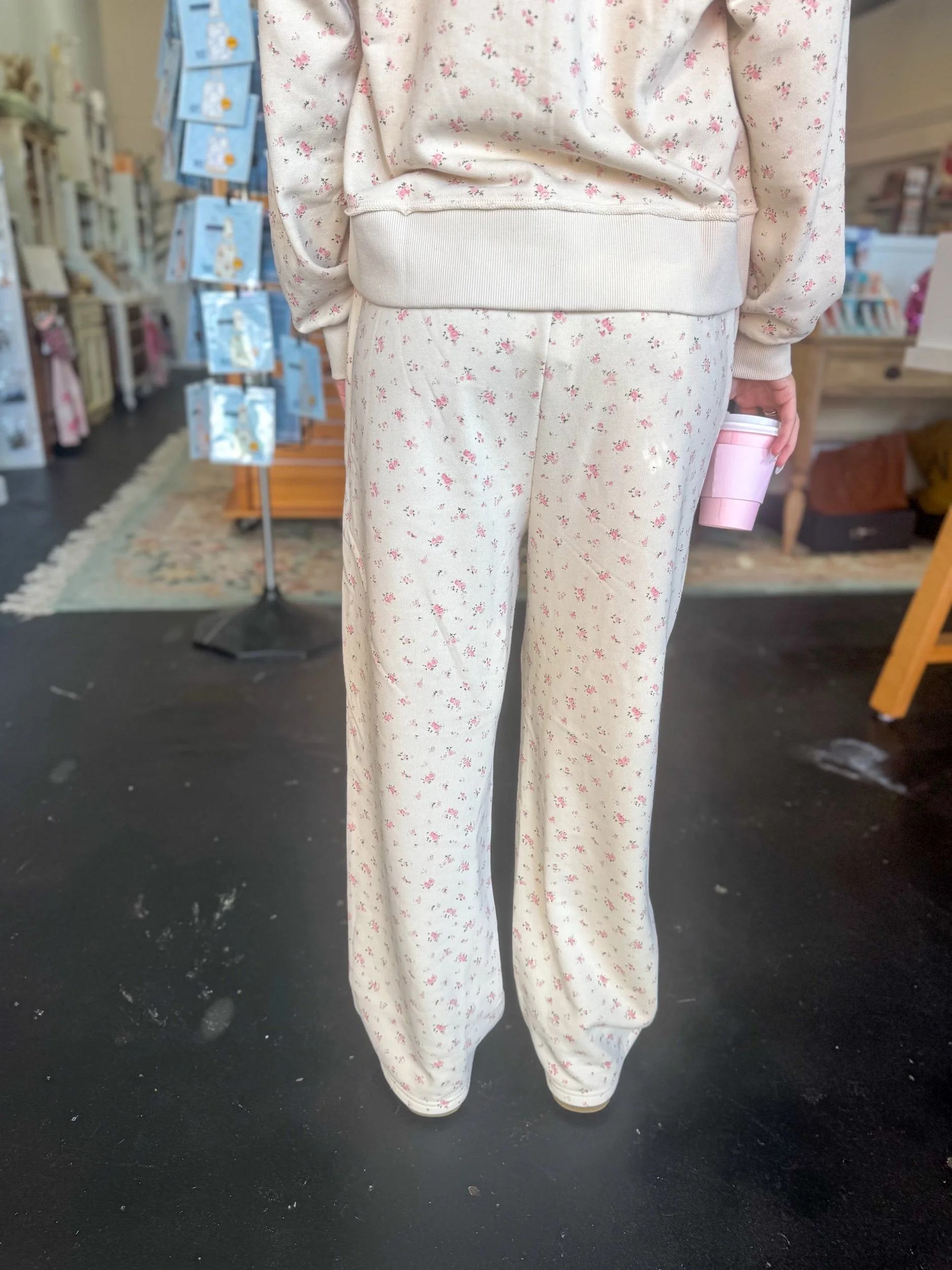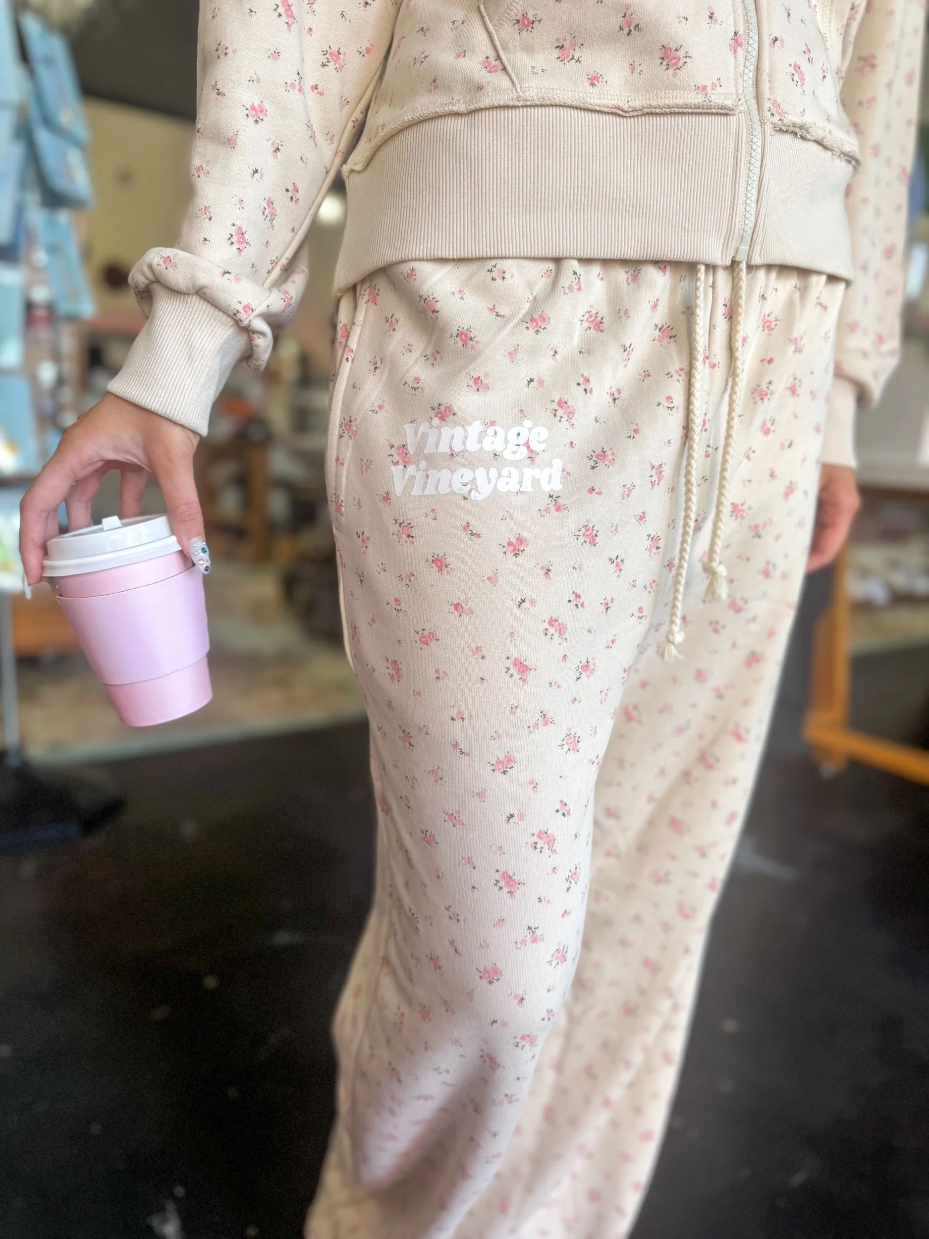 Ivory 2 piece set with pink floral pattern and Vintage Vineyard logo. Jacket has hood, pockets, and zipper closure. Pants have pockets, functional draw string with wide leg.