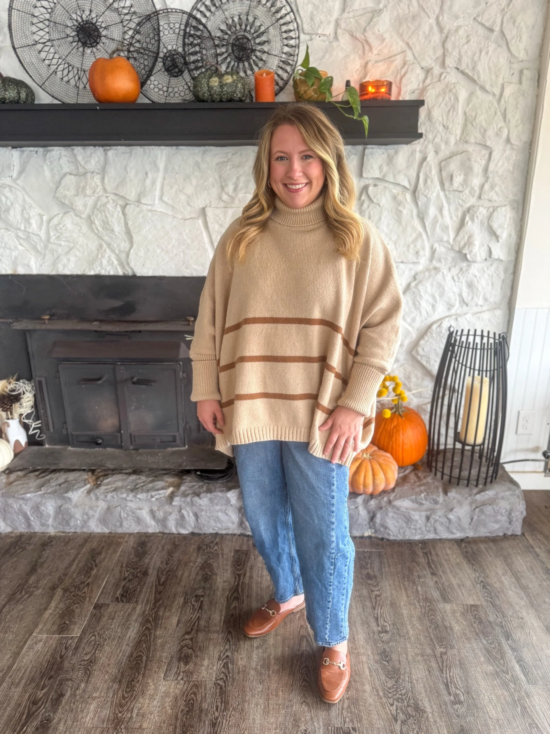 Light taupe sweater with striped detail, turtle neck neckline, foldable cuffed wrist, and bat wing sleeves. This piece is very roomie and flattering on most body shapes.