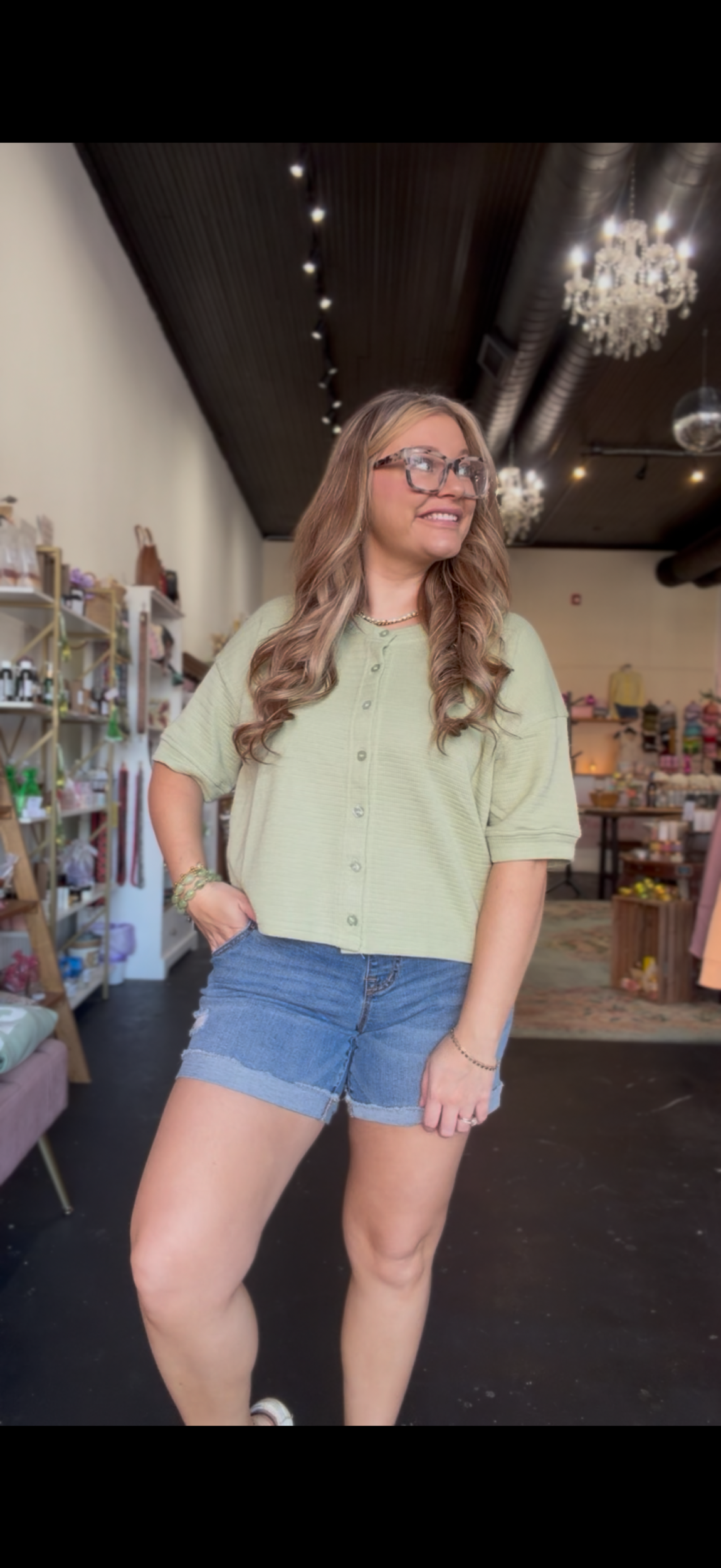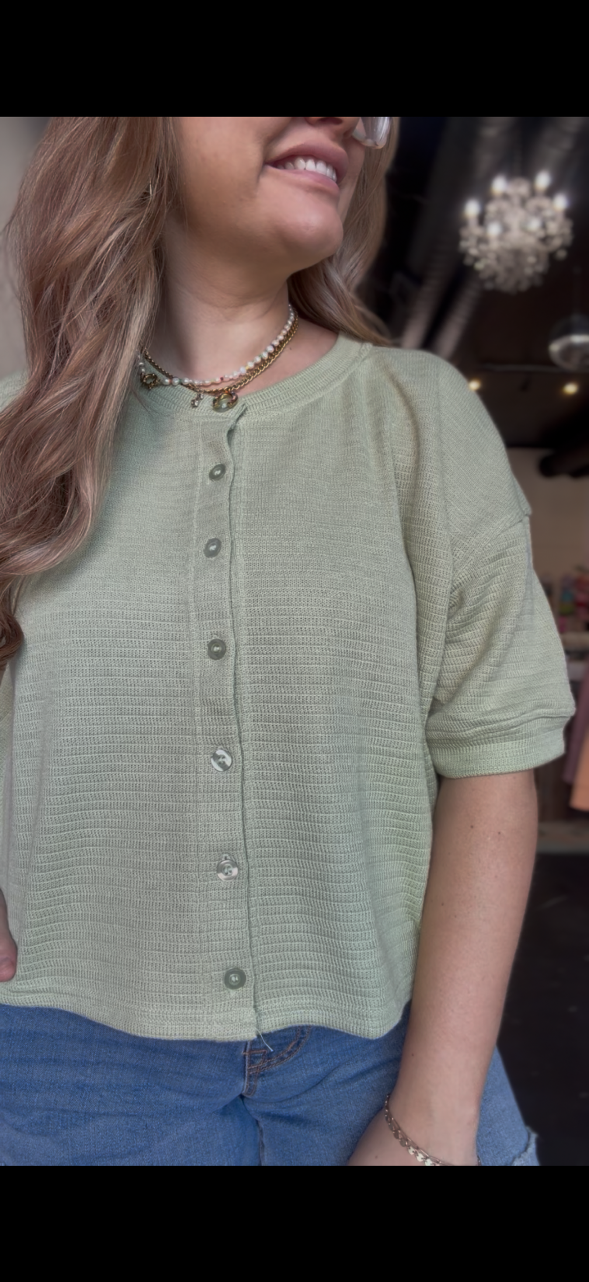 Light weight knitted sage green top with drop shoulder and functional buttons. Not cropped but shorter.