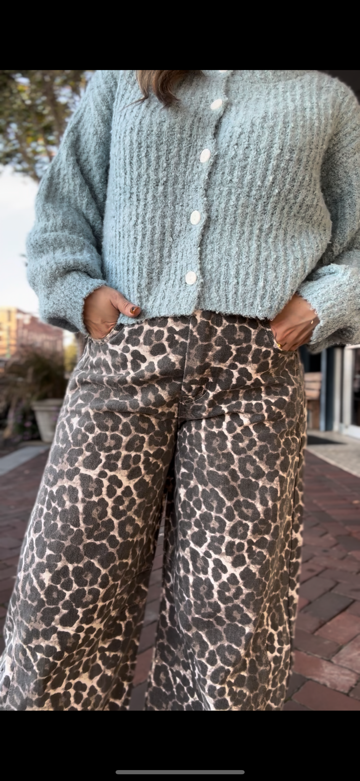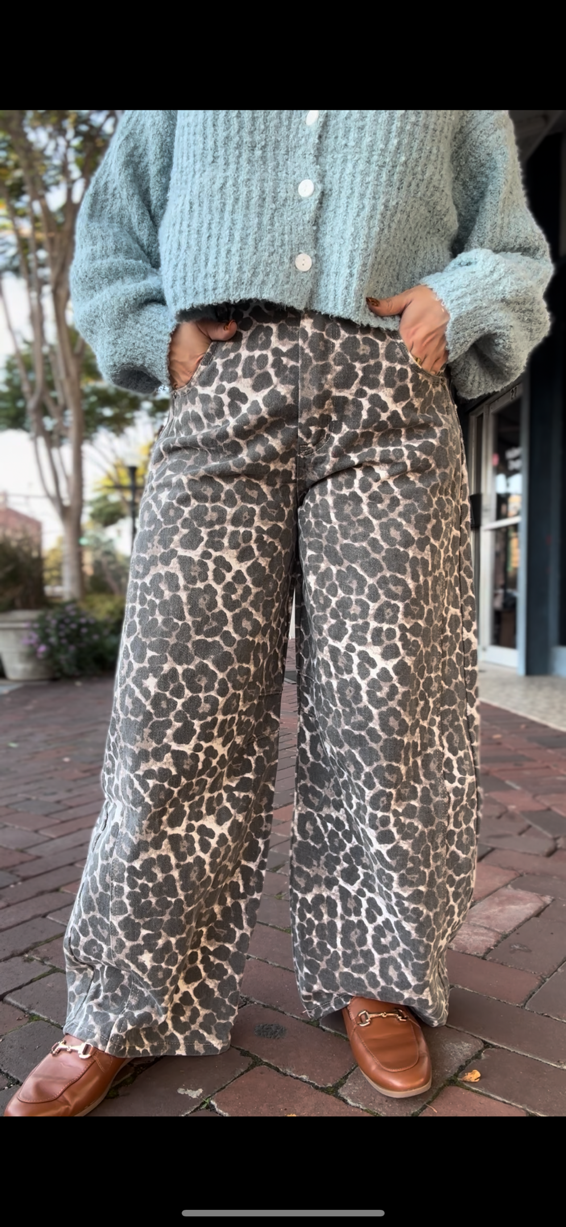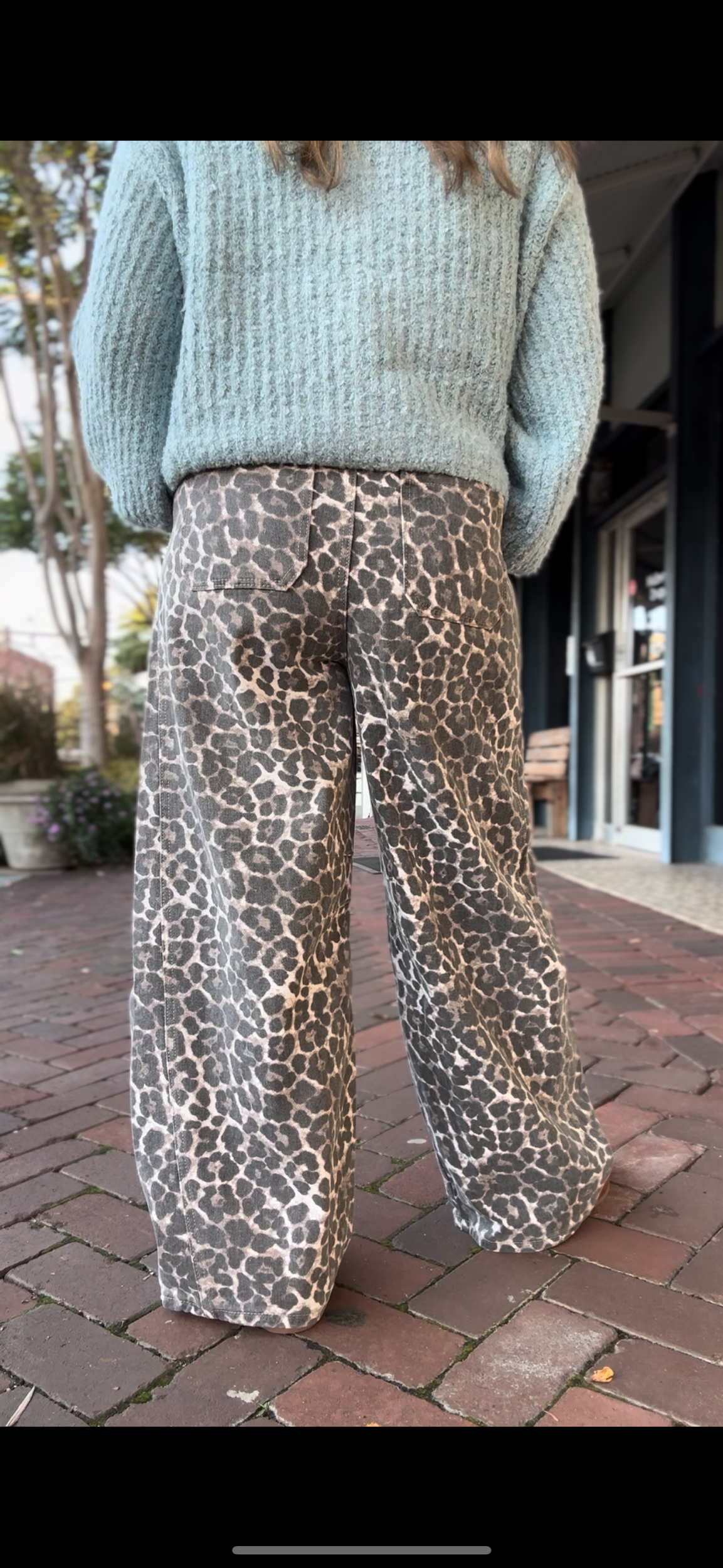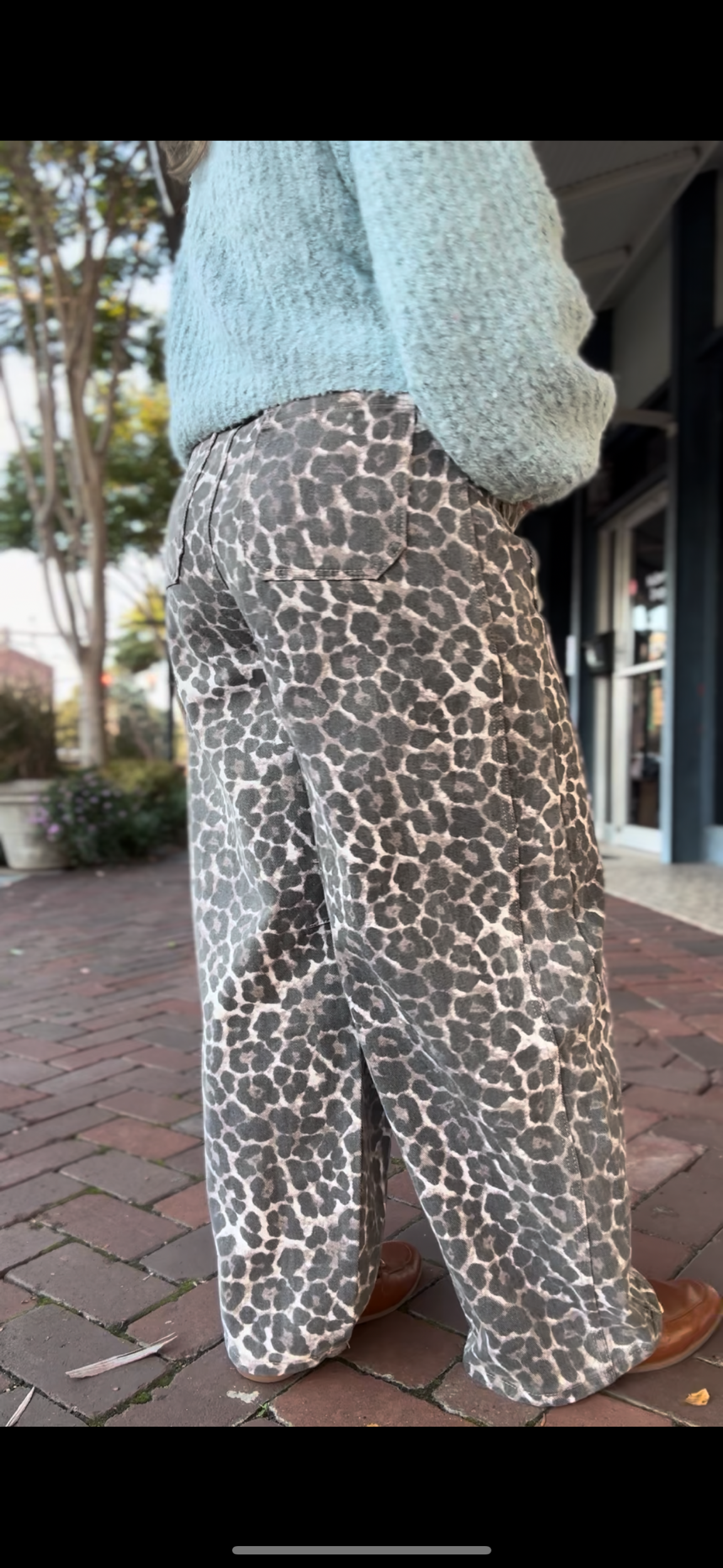 Leopard Barrel Jeans with elastic band in the back, functional pockets and button closure. No distressing.