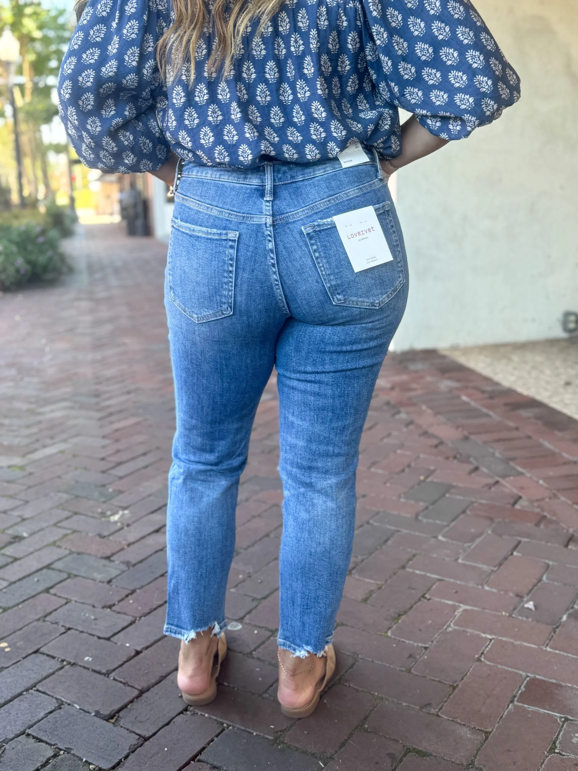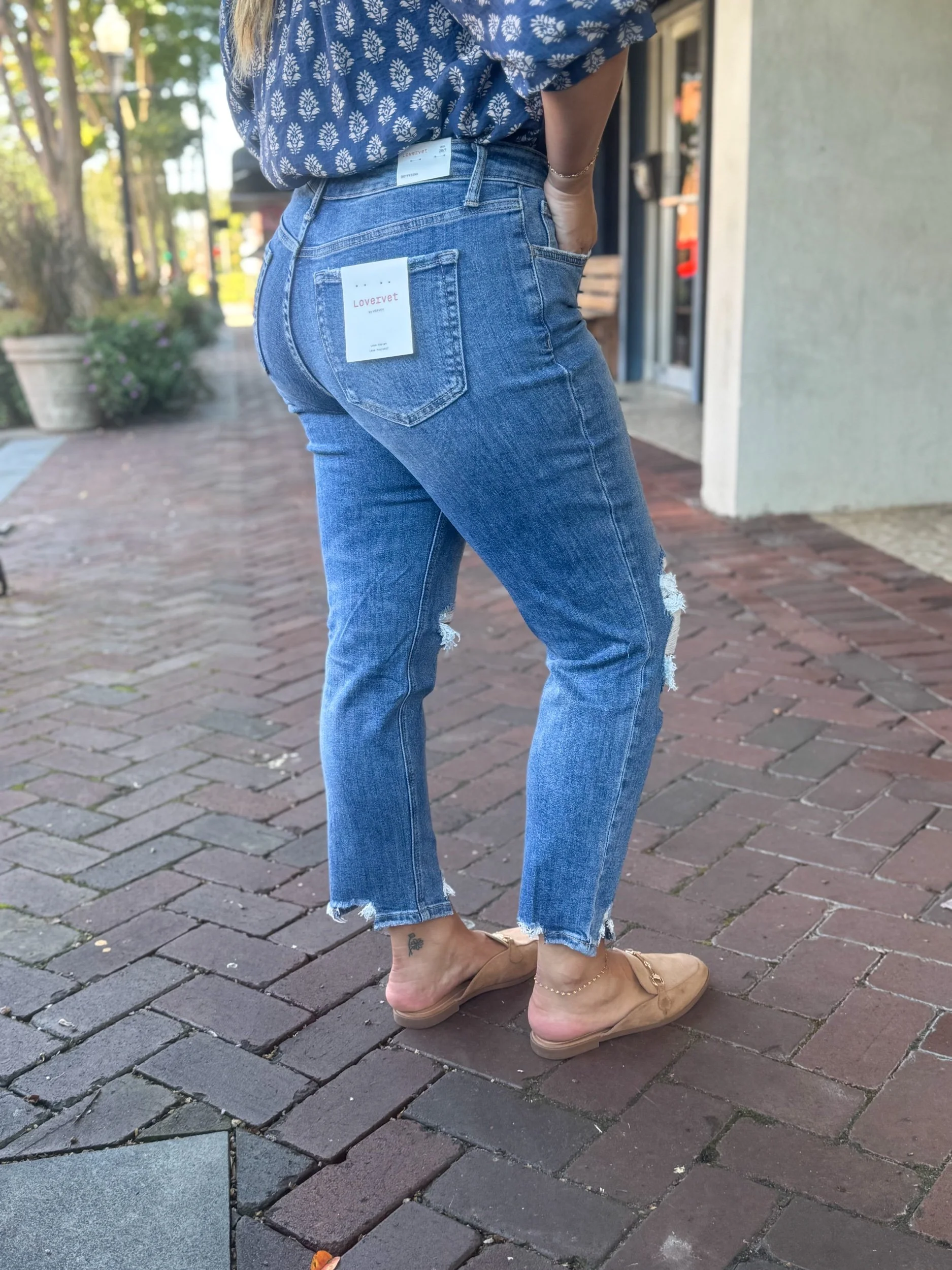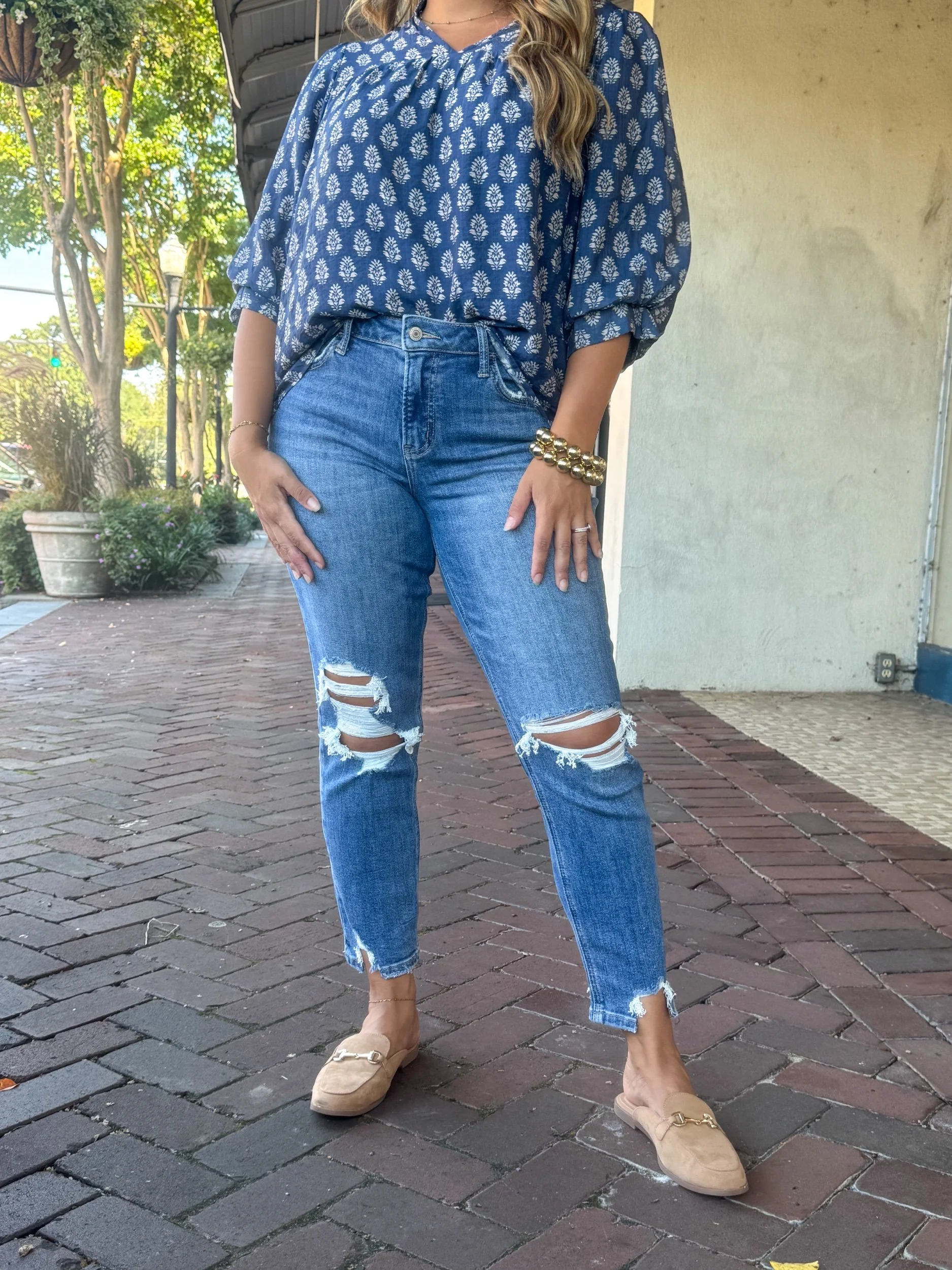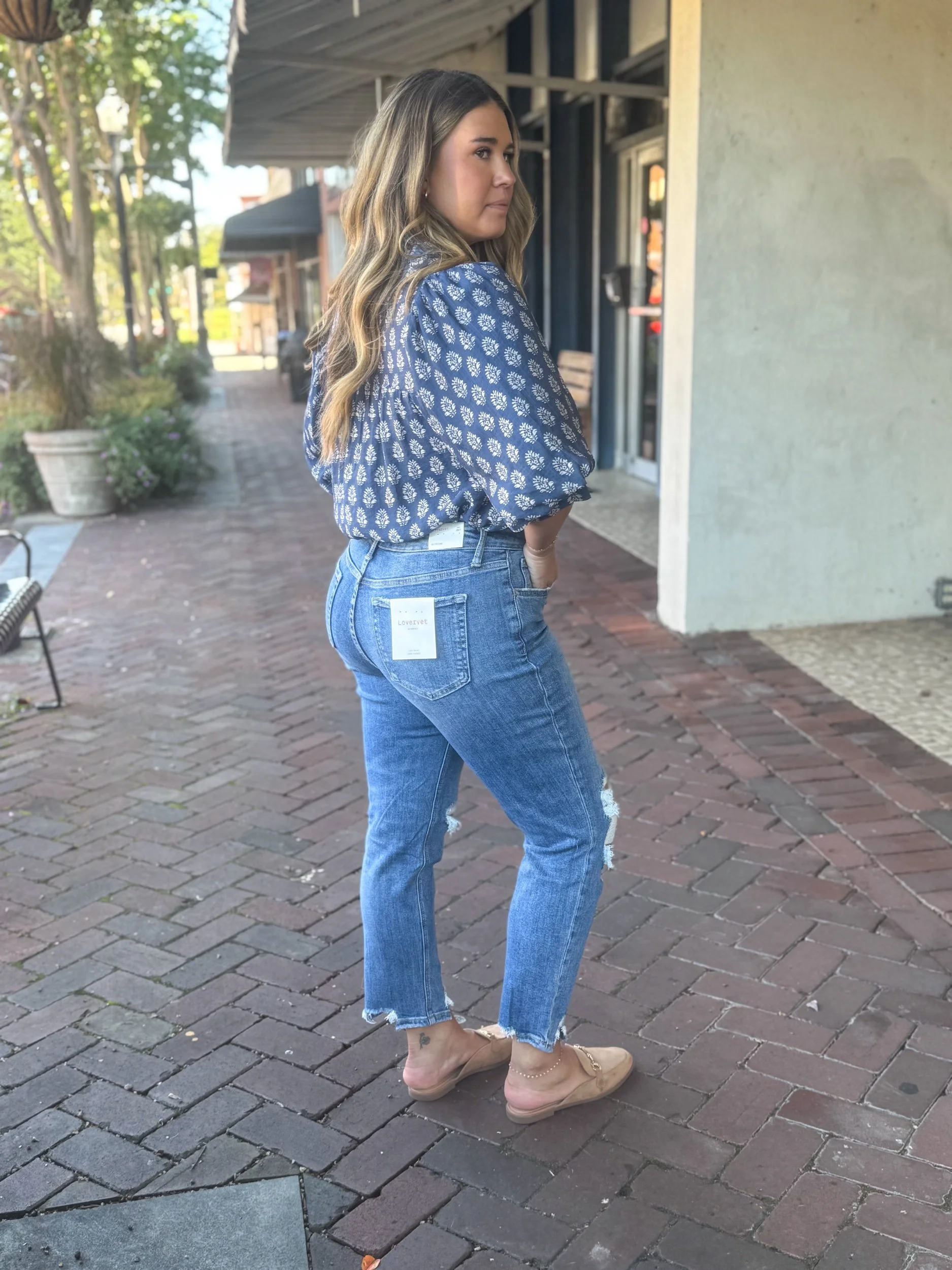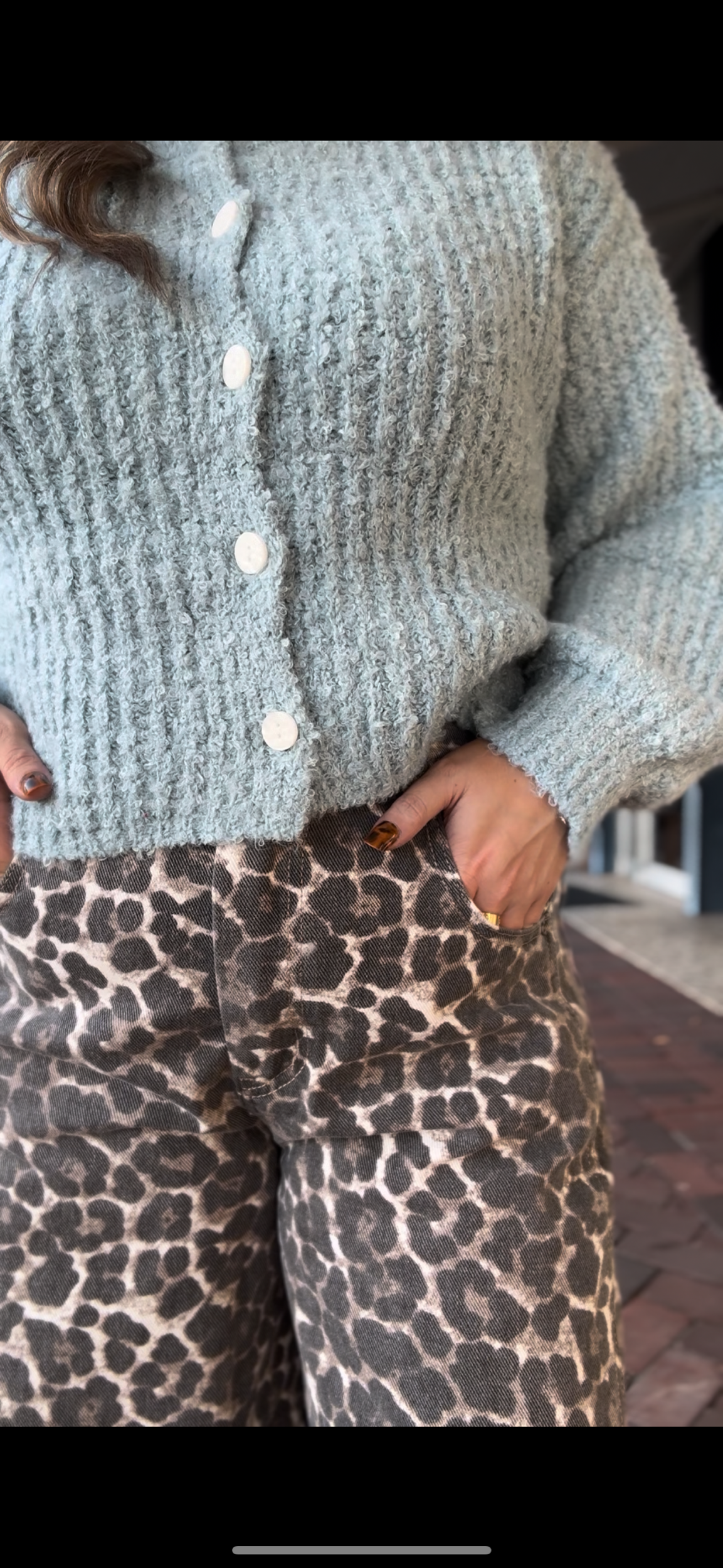 Leopard Barrel Jeans with elastic band in the back, functional pockets and button closure. No distressing.