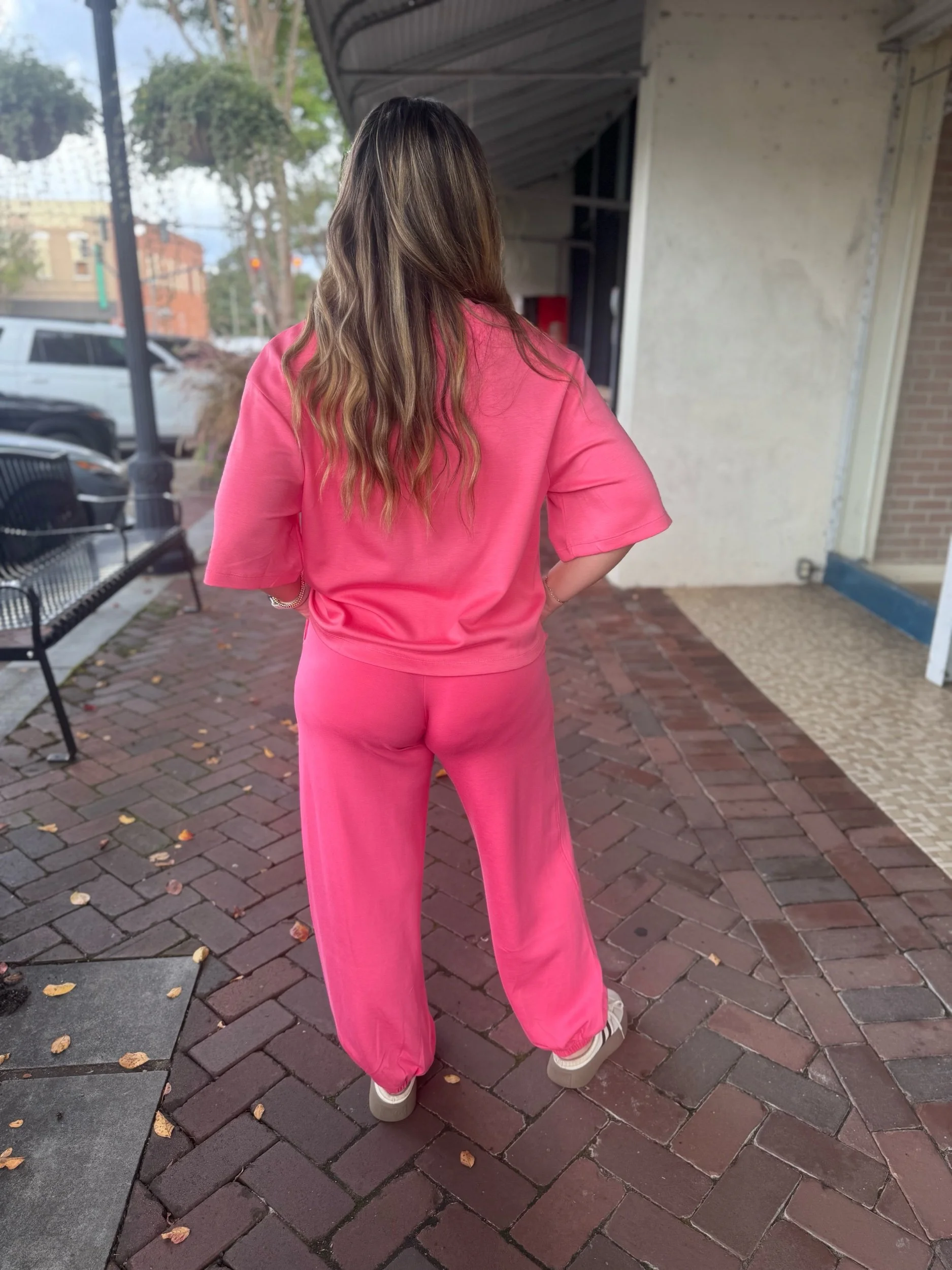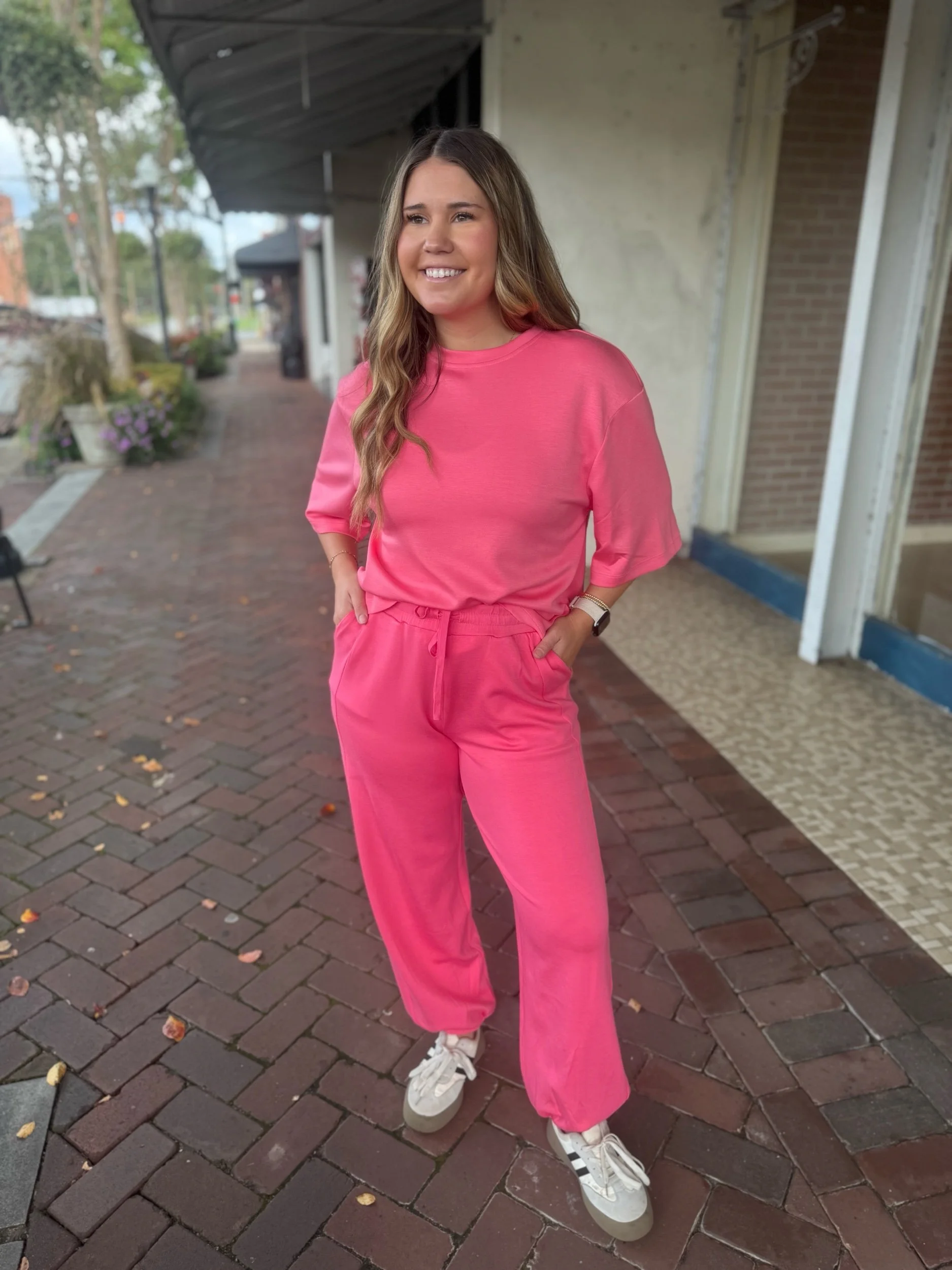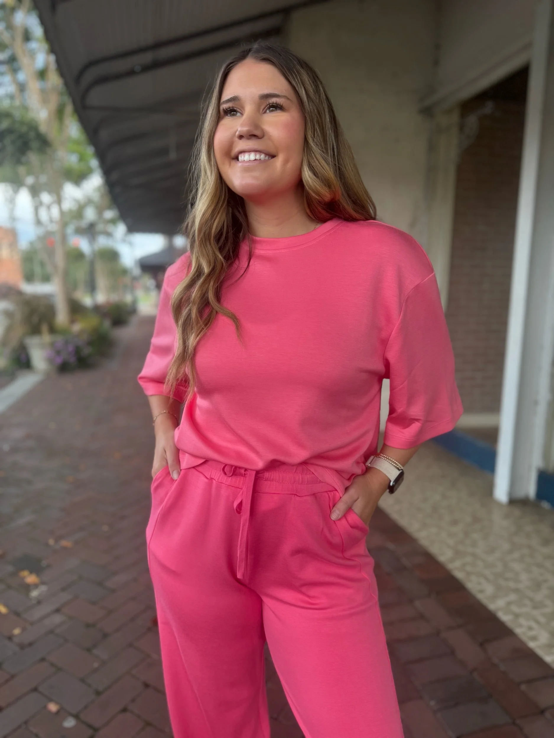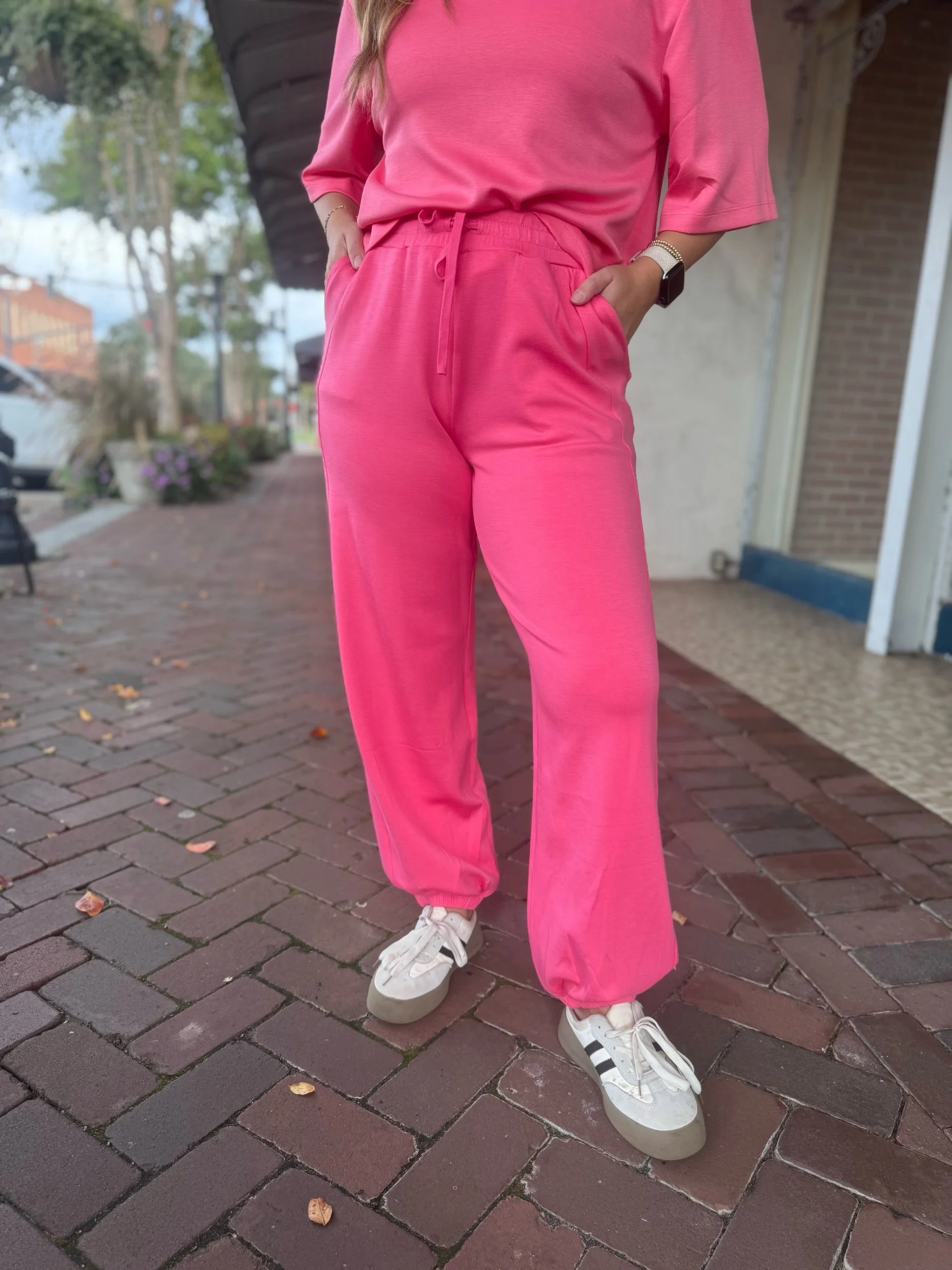 Butter soft pink two piece set with boyfriend style sleeves, elastic waistband, pockets, and elastic at the ankles for a jogger fit.