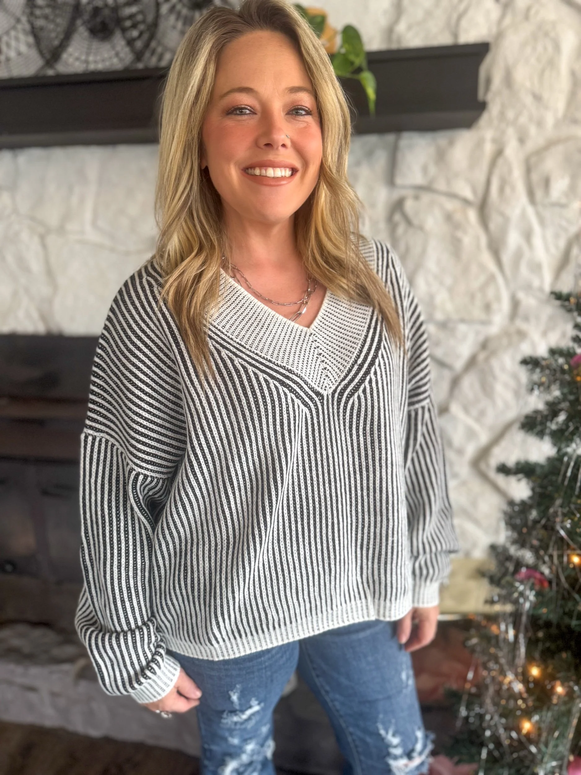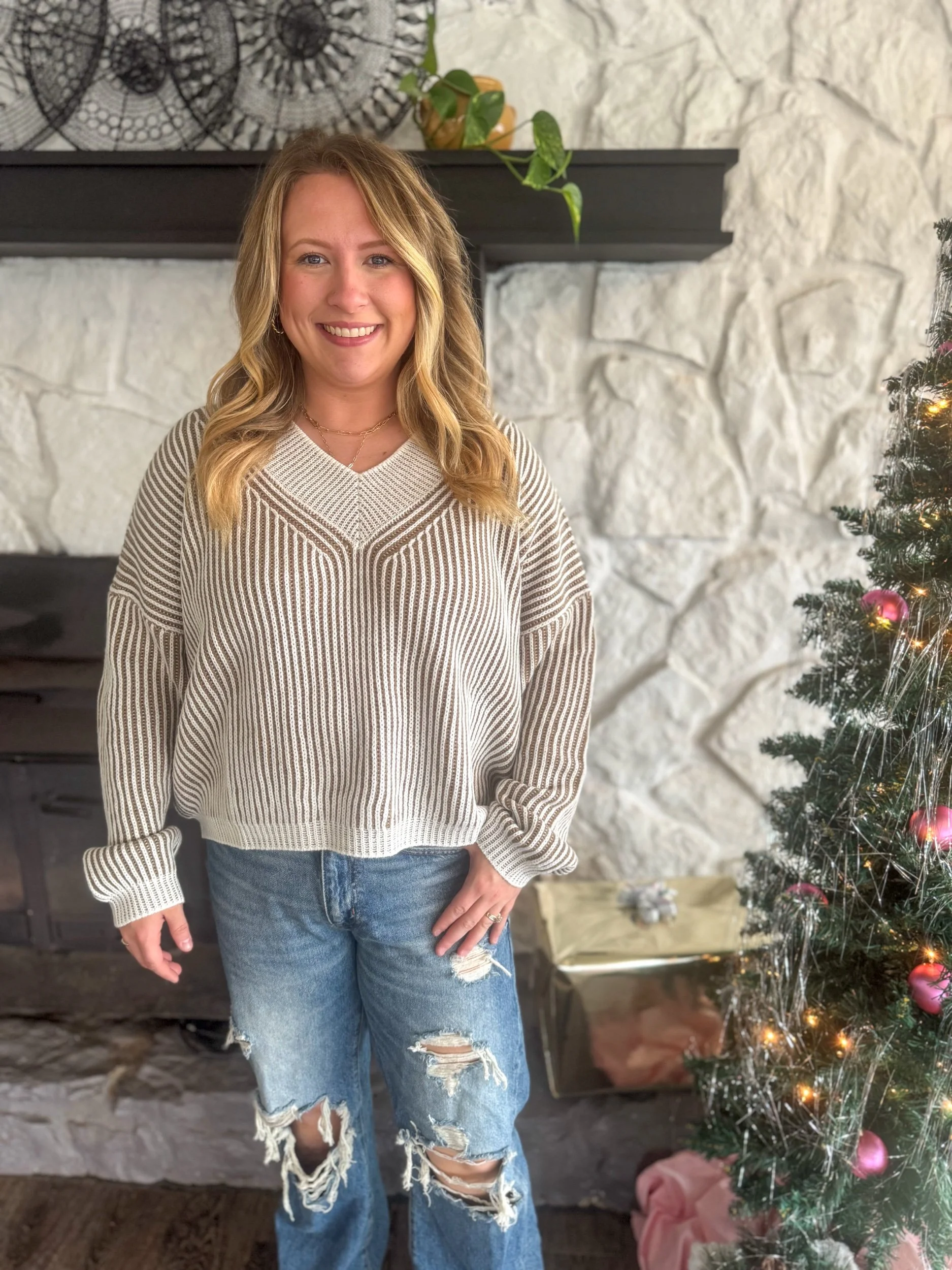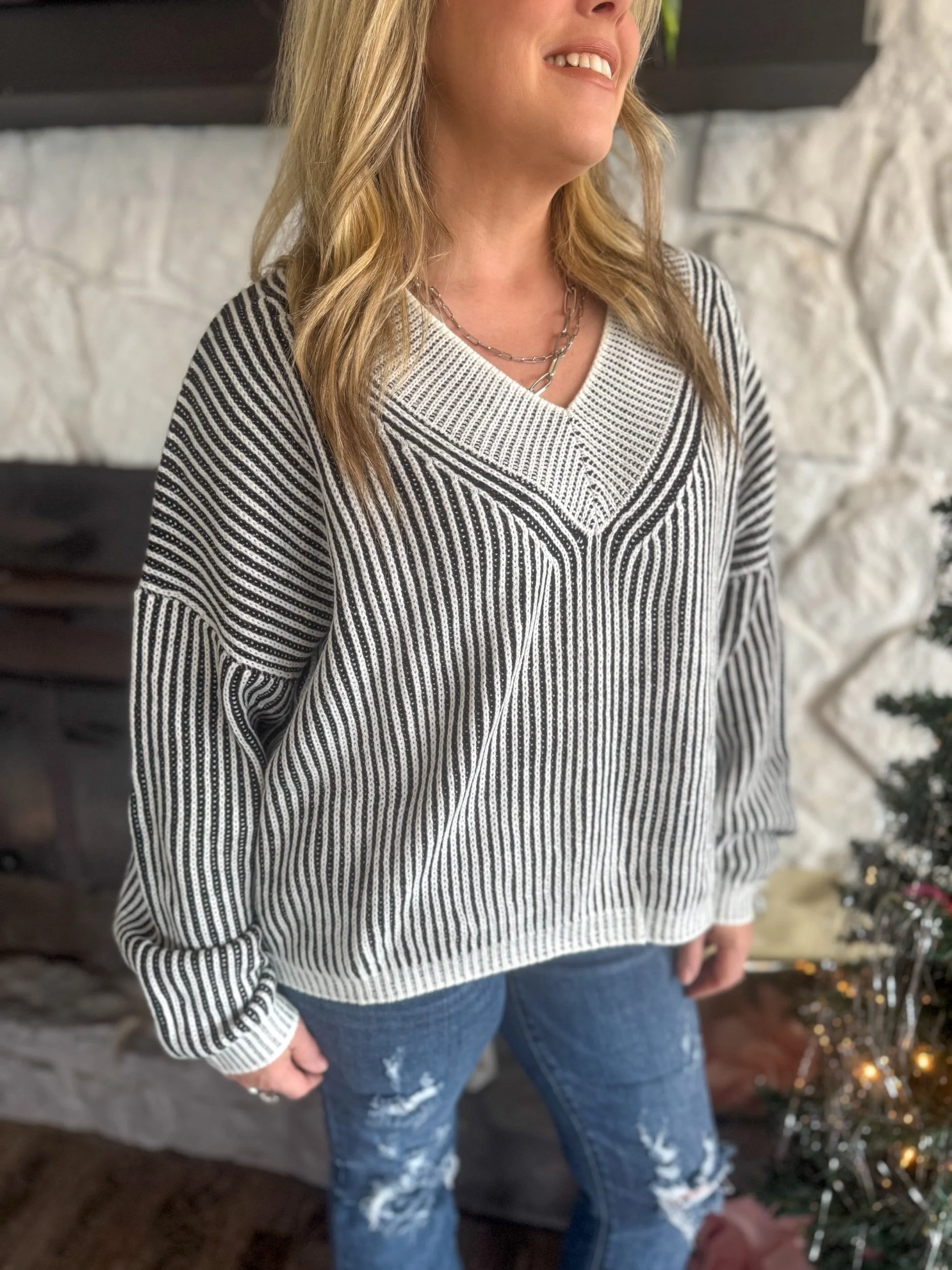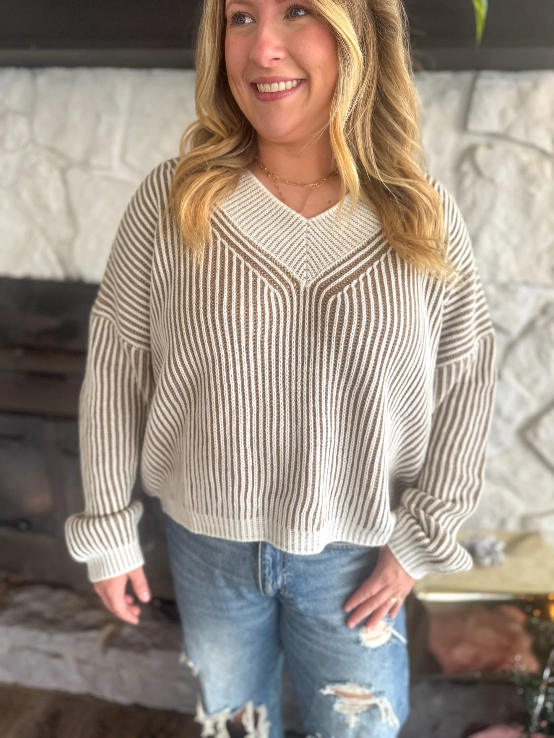 Ribbed two toned sweater, relaxed fit with v neck neckline and drop shoulder detail. Wide band trim at cuff & neckline.